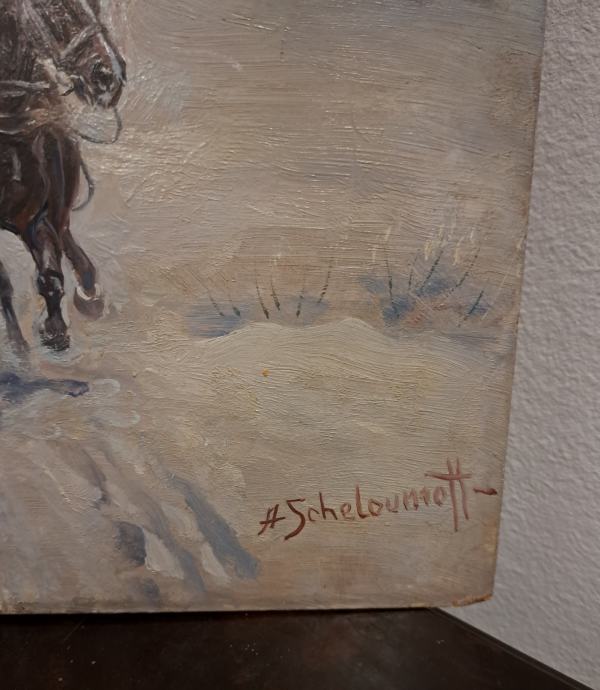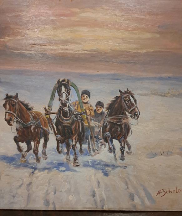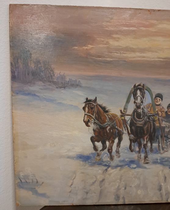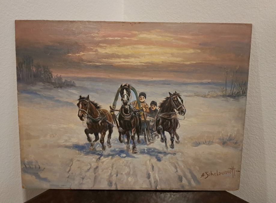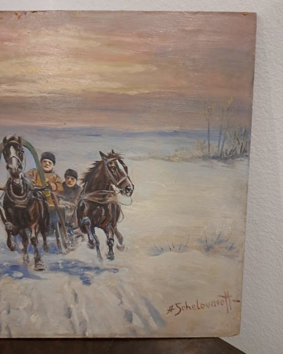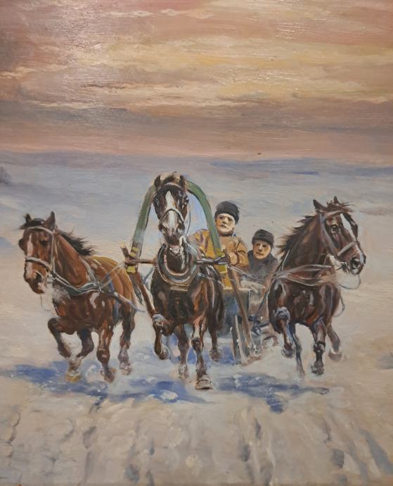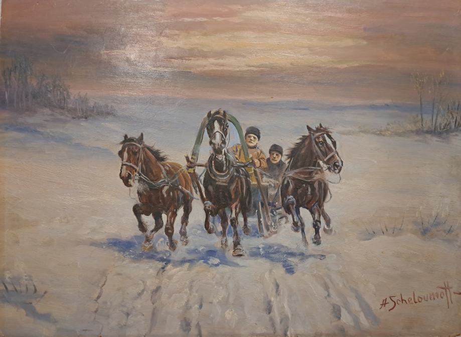 Prikaz saonica sa 3 konja rađena od autora Afanasij Ivanovic Scheloumoff koji je rođen u Ukrajini 1892.