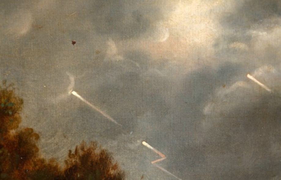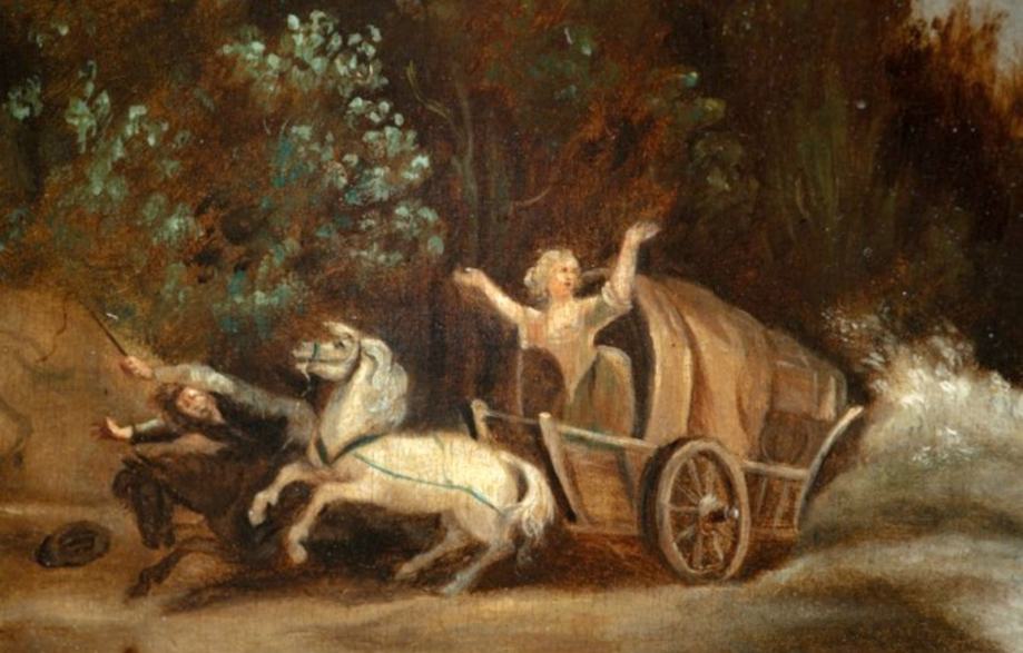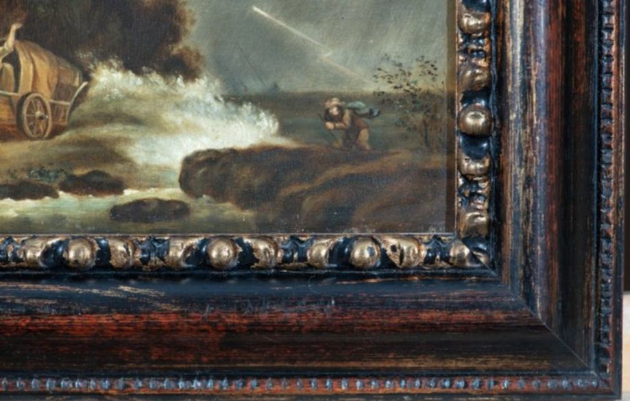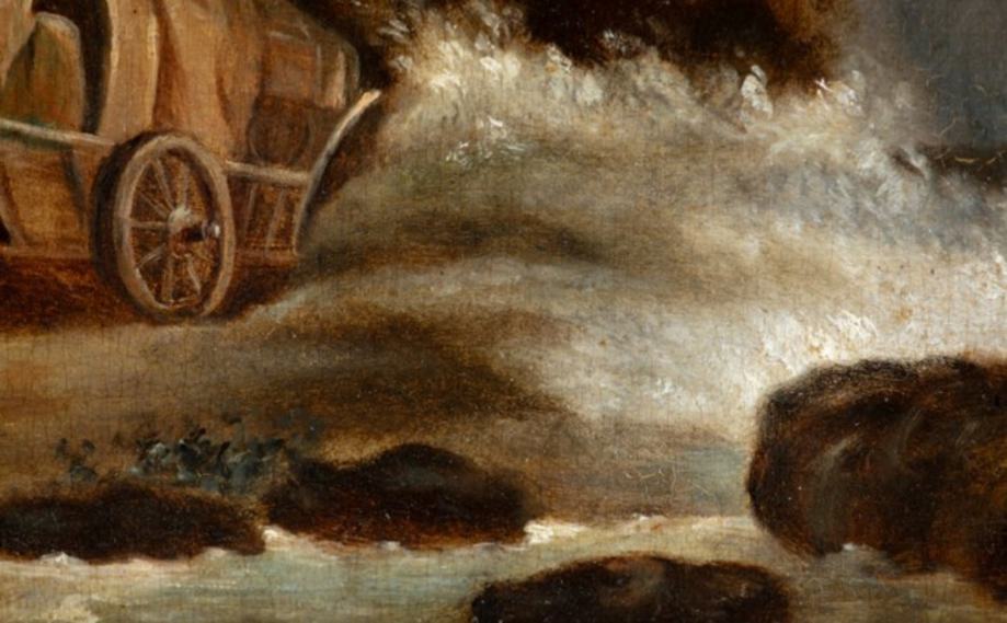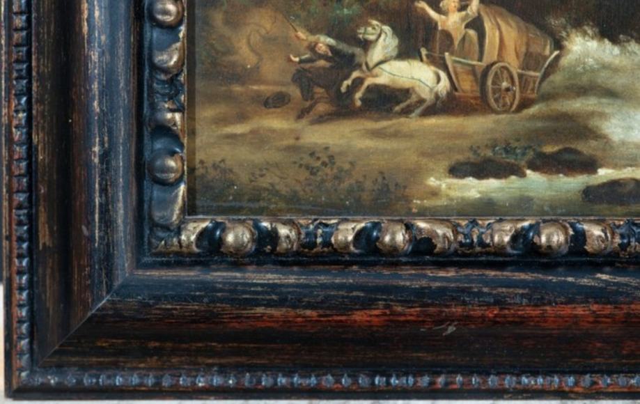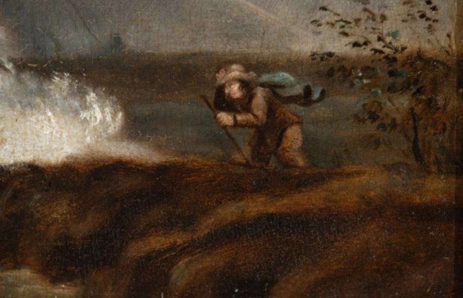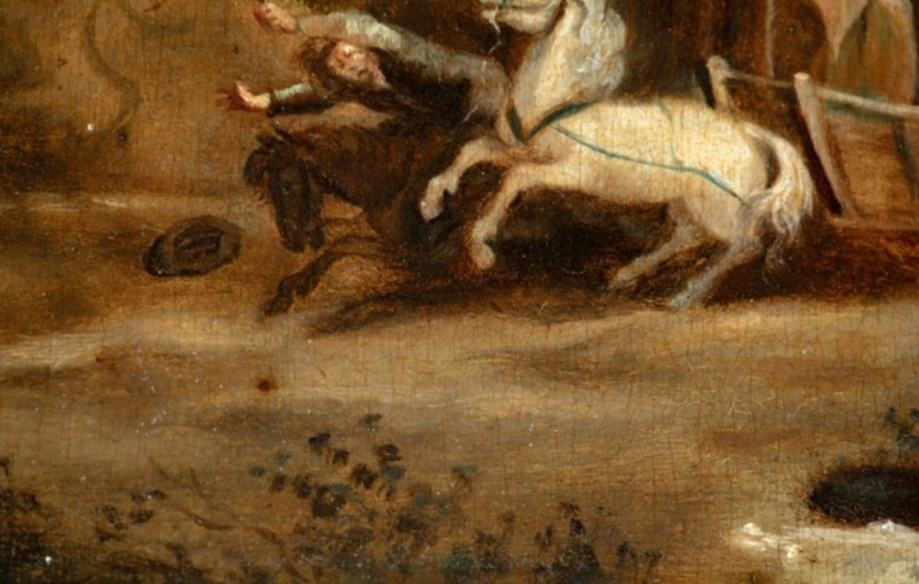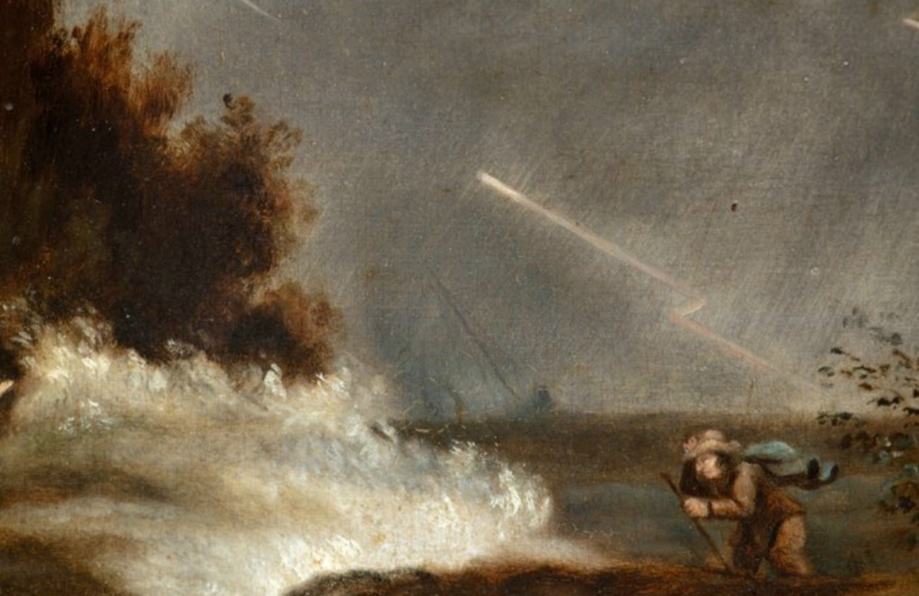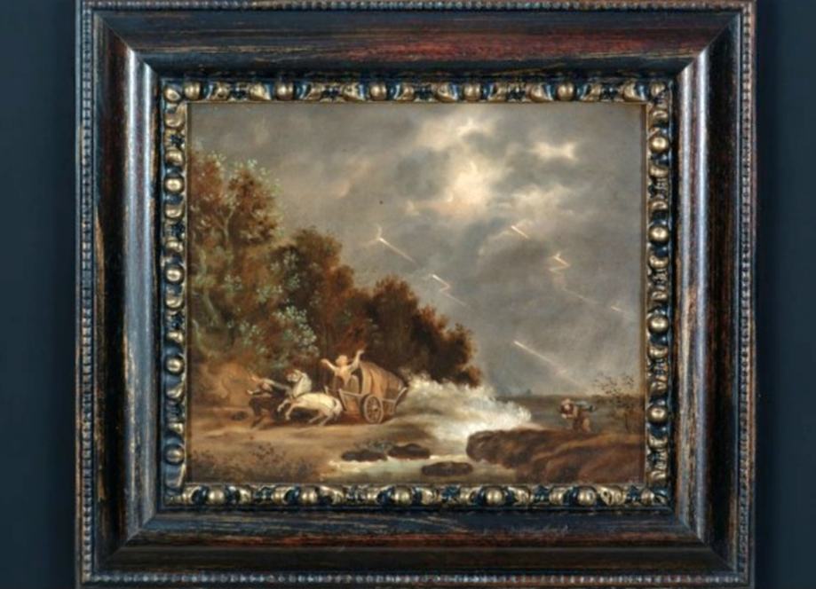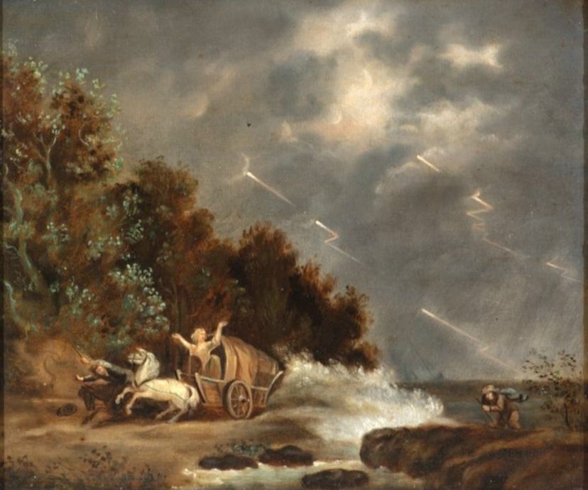 Ova atmosferična i dramatično izvedena slika, koja se pripisuje sljedbeniku Aerta van der Neera, prikazuje olujni krajolik s prijetećim nebom i munjama koje prelaze tamno nebo. Prizor je ispunjen pokretom i emocijama: odbjegli konj s kolima punim putnika pokušava se spasiti od neposredne opasnosti, dok se lik u prvom planu odupire vremenskim nepogodama.