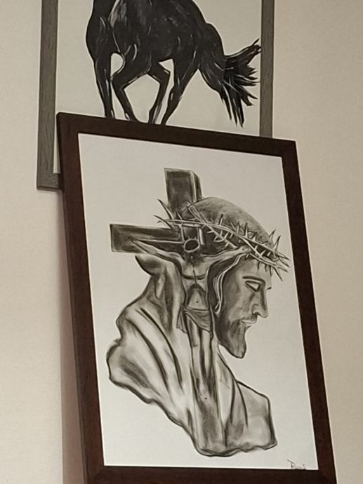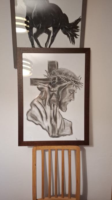 Na slici je Krist s trnovom krunom u profilu, izveden crtački – gotovo skulpturalno. Lice je spušteno, oči zatvorene ili zasjenjene, izraz duboke sabranosti i prihvaćenog trpljenja, a ne dramatike. Križ nije samo pozadina nego ulazi u volumen tijela – gotovo kao da Krist i križ postaju jedno. To je teološki vrlo snažno: križ nije teret izvana, nego prihvaćena sudbina.