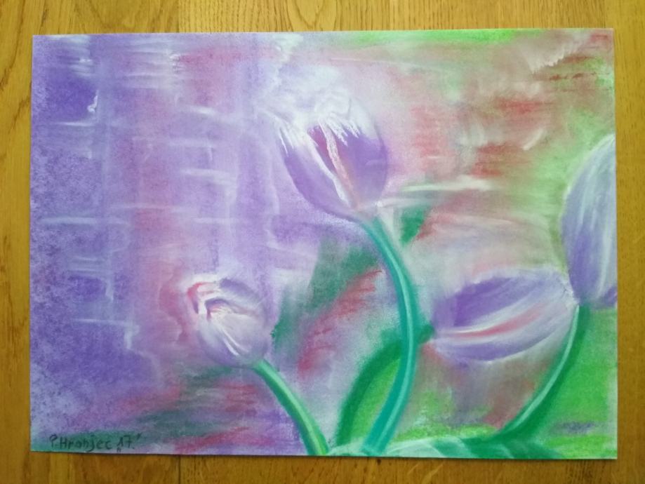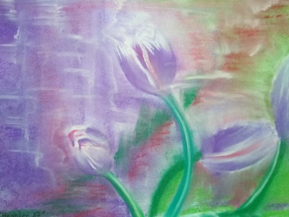 Prodaje se umjetnička slika s prikazom tulipana, slika je naslikana suhim pastelama na papiru, u realistično-apstraktnom stilu. Slika nije uramljena, a dimenzije su joj 40cm x 28cm.