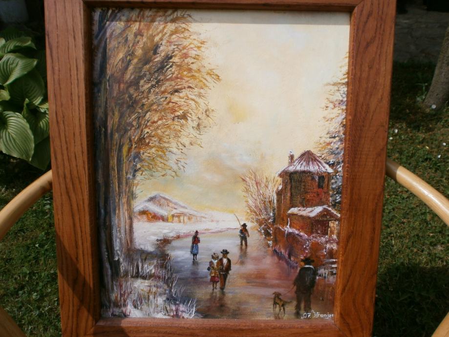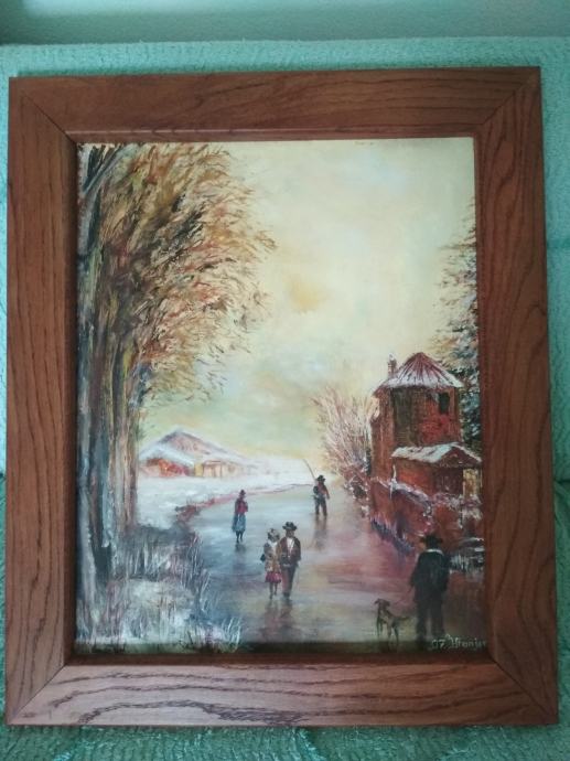 Prodaje se umjetnička slika "Zima", naslikana tehnikom ulja na lesonitu, slika je dimenzije 61cm x 51cm (s okvirom). Prodaje se uokvirena u kvalitetan drveni okvir.