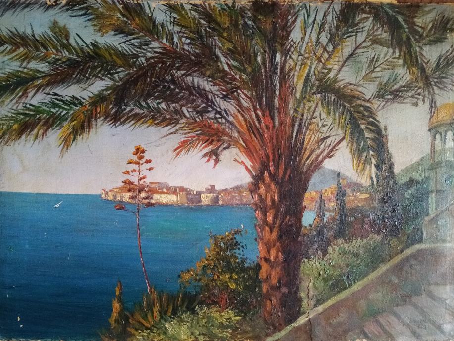 Pogled na Dubrovnik - ulje na kartonu, dim 27x39 cm., autor V. Nedbal 1927.