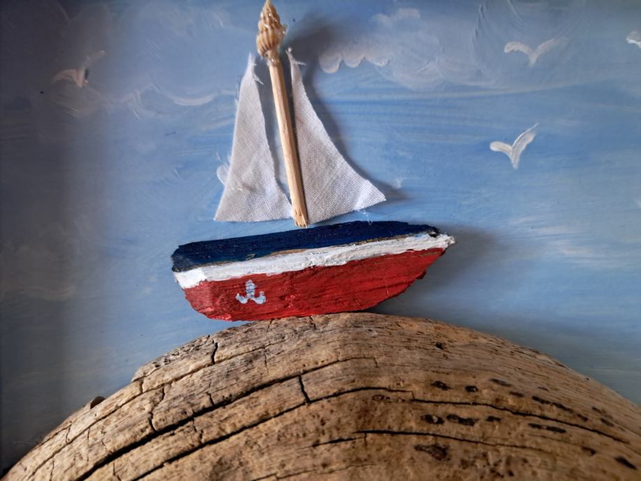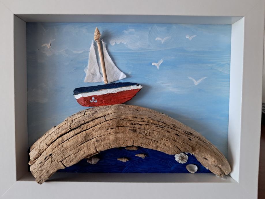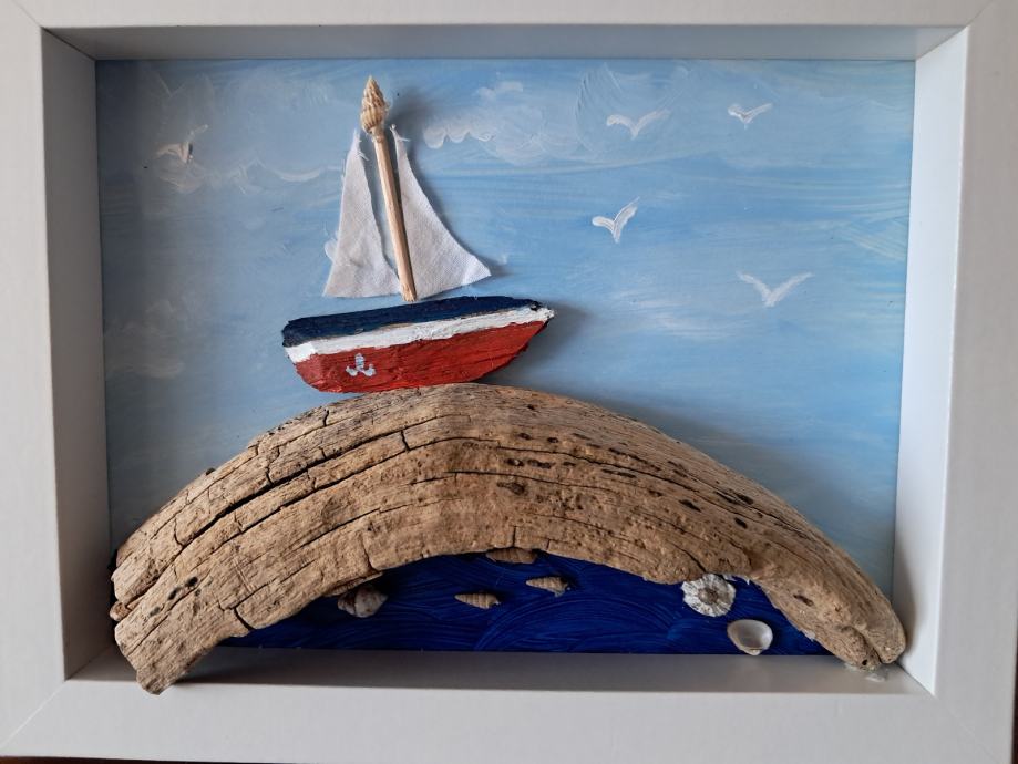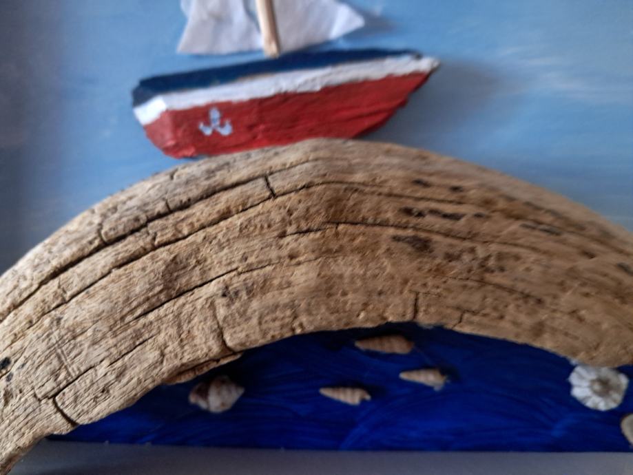 Ova lijepa slika nastala je od jedinstvenog komada morske naplavine i pretvorila se u sliku malog brodića na valu.Dimenzija slike je 22,5 × 18 cm.