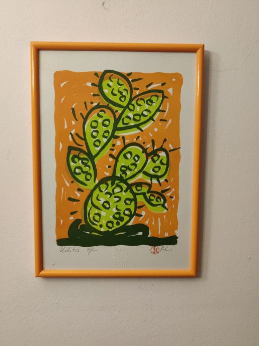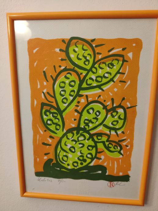 Prodaje se originalna grafika poznate hrvatske umjetnice Vande Vilić. Rad pod nazivom "Kaktus" karakterizira prepoznatljiv ekspresivan stil autorice, s jarkim koloritom (narančasta i limun zelena) koji unosi vedrinu u svaki prostor.