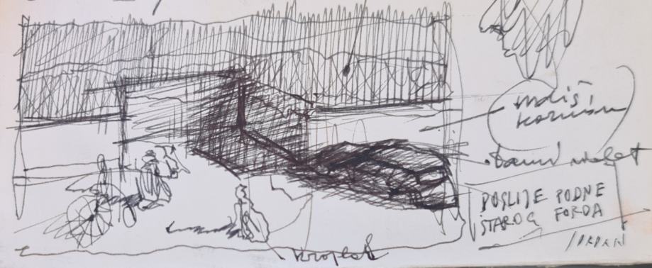 Vasilije Jordan "Poslije podne starog forda" kemijska olovka 7x15cm; oko 1980 godine; papir 30x20cm, ali na gornjem djelu 2 skice koje su zasebne, a ova minijatura dolje je cjelovita, dobivate kompletnu sliku pa sami odlučite kako čete uramiti...