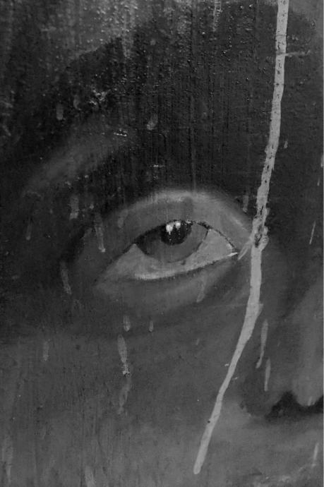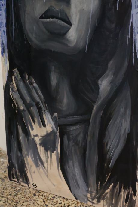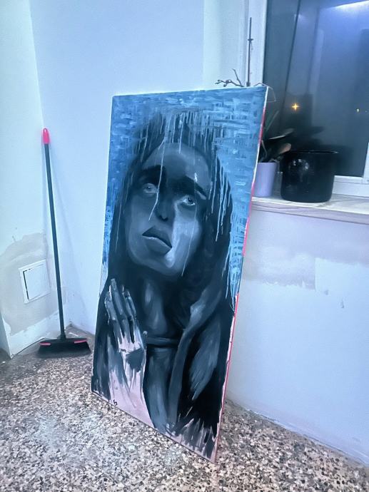 Vertikalna kompozicija inspirirana je ikonografijom Djevice Marije, ali je lišena klasične svetosti i zlatnog sjaja. Umjesto aureole, lice obavija hladna plavičasta tišina. Umjesto utjehe – samo tragovi suza koji se slijevaju niz površinu platna poput kiše po staklu.