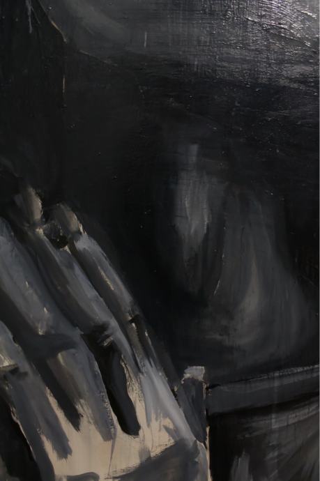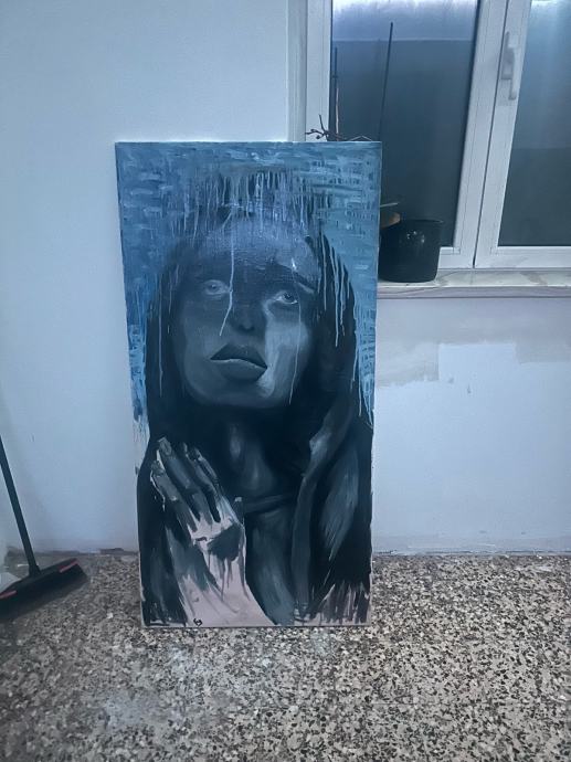 Plavi tonovi referiraju na tradicionalnu boju Marijina plašta, dok razlivena struktura ulja razgrađuje svetost i pretvara je u ljudsku, sirovu emociju. Ova slika ne prikazuje svetu figuru — već osjećaj napuštenosti, tihe patnje i pitanja: tko ostaje kada nestane vjere, kada nestane utjehe?