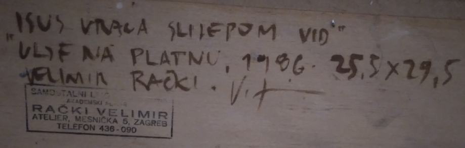 Slika djelo "Isus vrača slijepom vid" je naslikano 1986. Tehnika je ulje na platnu, a dimenzije sa okvirom 56,5 cm x 42,8 cm.
