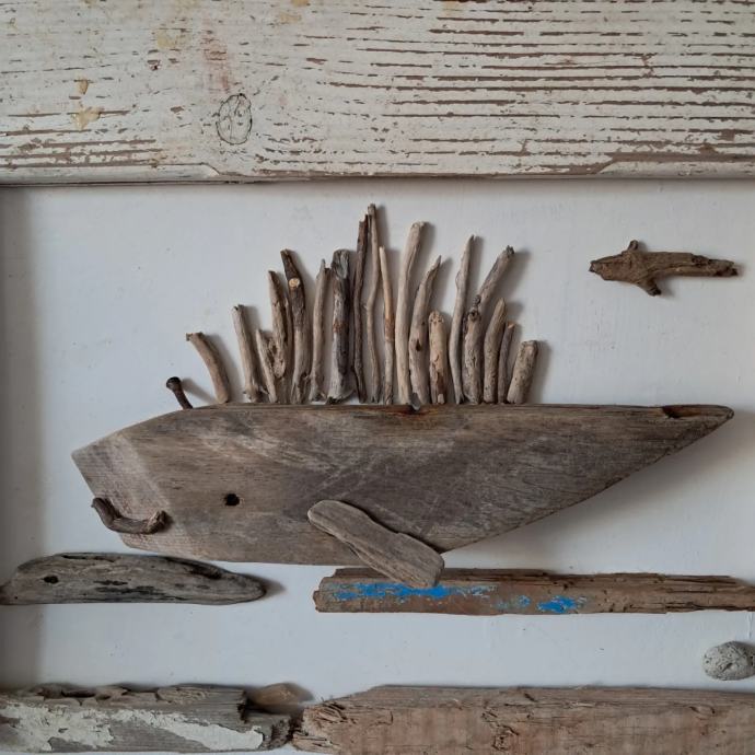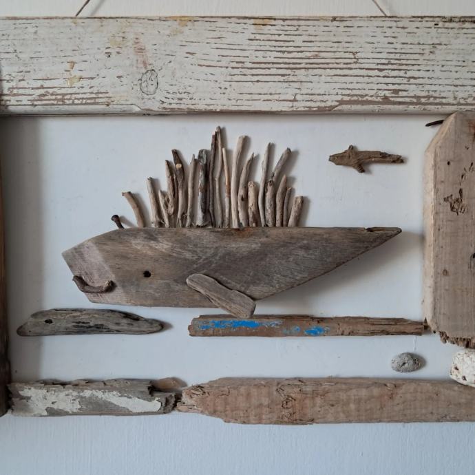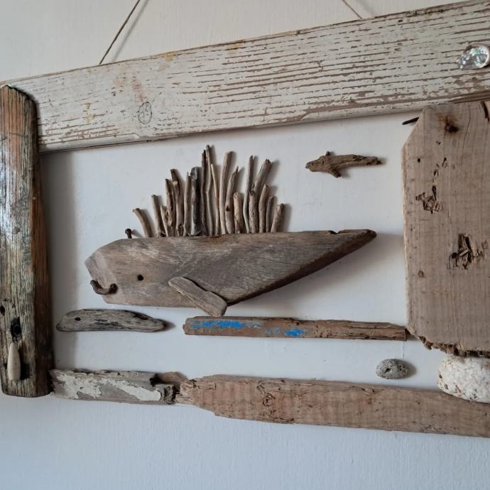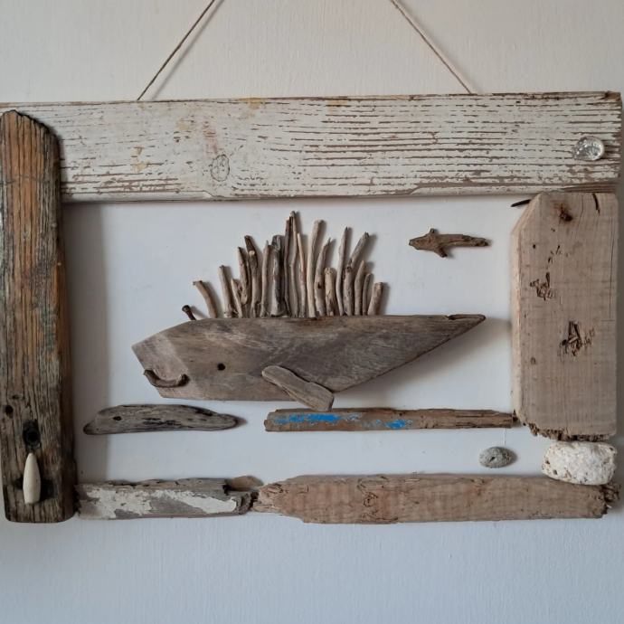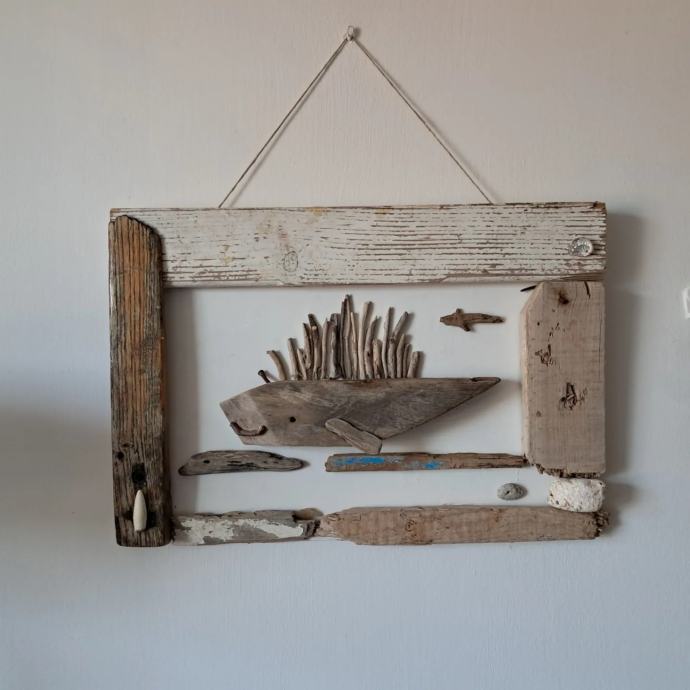 Ova duhovita slika nastala je od različitih komada naplavina iz mora.Sastavljenih uz malo mašte, pretvorena je u ovu veselu ribicu u moru.Dimenzija ove slike je 56 × 39 cm.