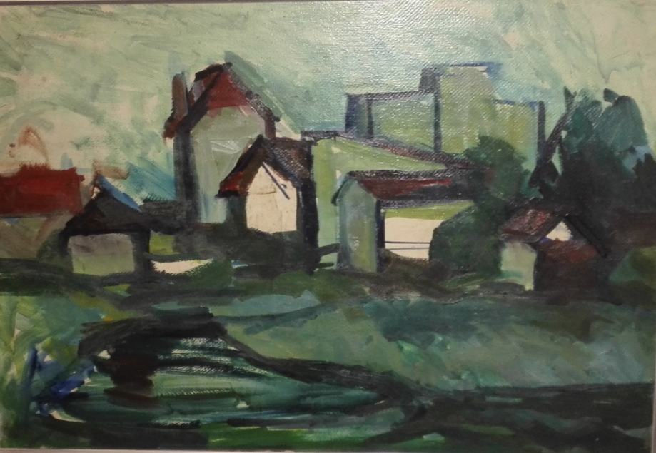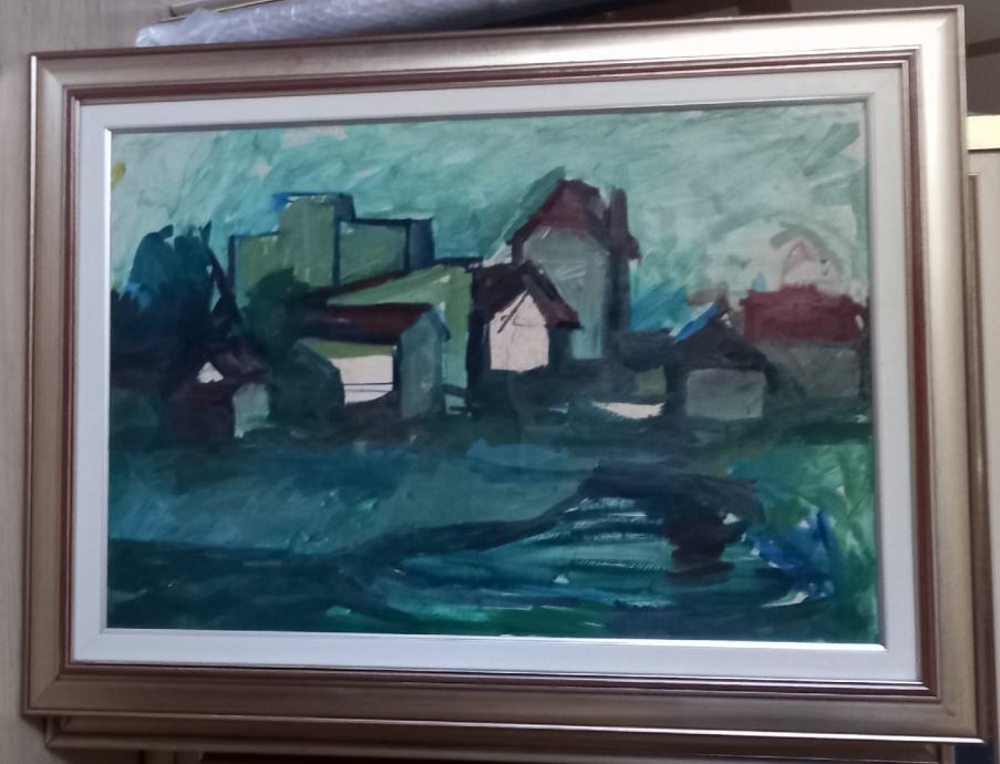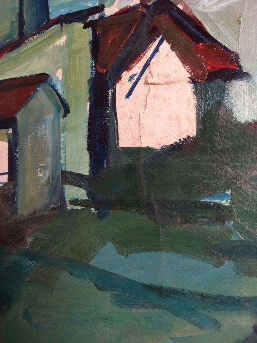 Slika ima malo oštećenje u obliku crte na bijeloj fasadi zgrade,uokvireno.