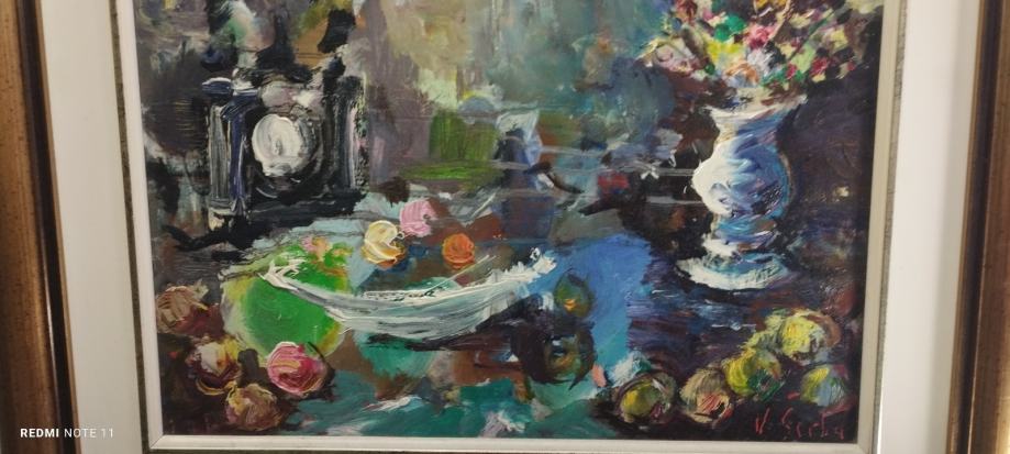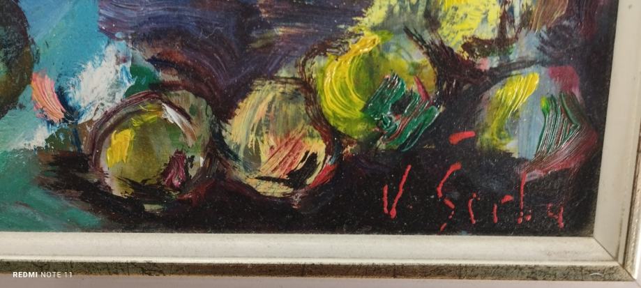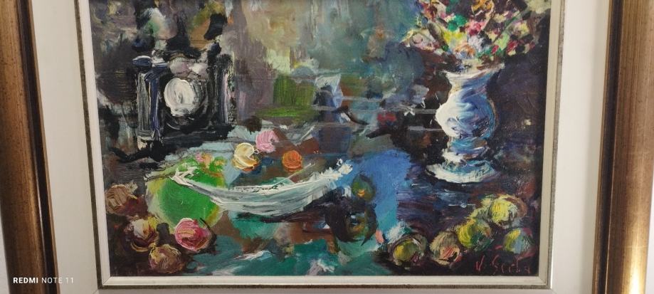 "MRTVA PRIRODA SA SATOM", ulje na lesonitu,25 x 38 cm, 1986.