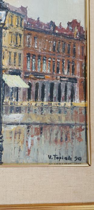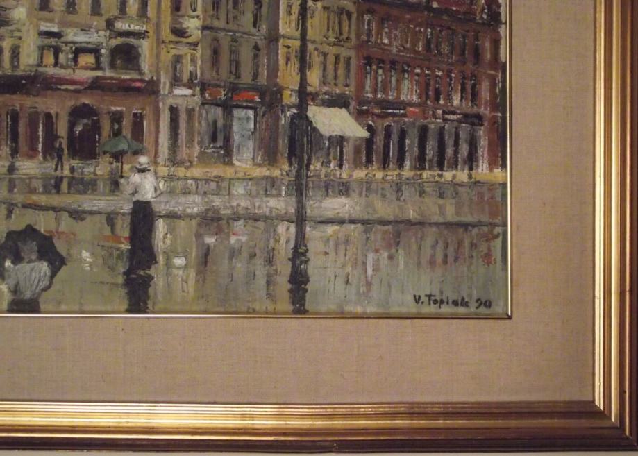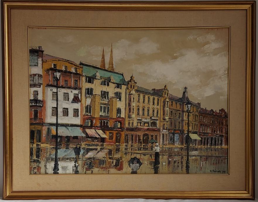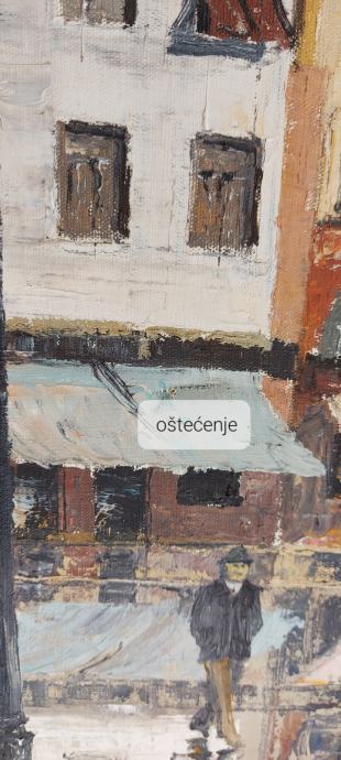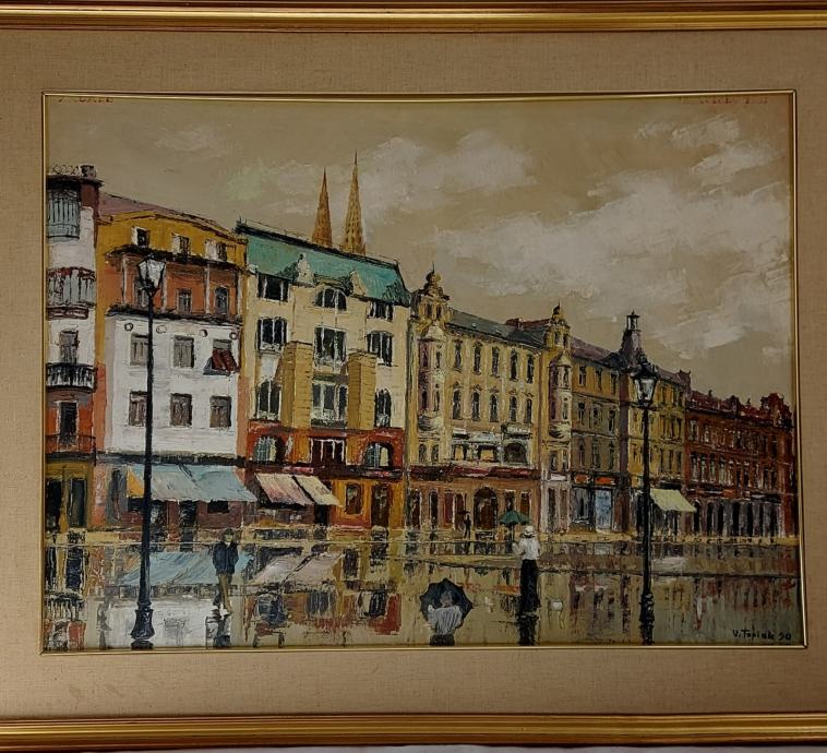 Vilim Toplak, akademski slikar, ulje na platnu, Jelačićev trg, Zagreb, dimenzije okvira dužina 102 cm, visina 81cm, slika 80 cm x 58 cm, cijena 600,00 eura. Platno je malo oštećeno, gotovo nevidljivo.