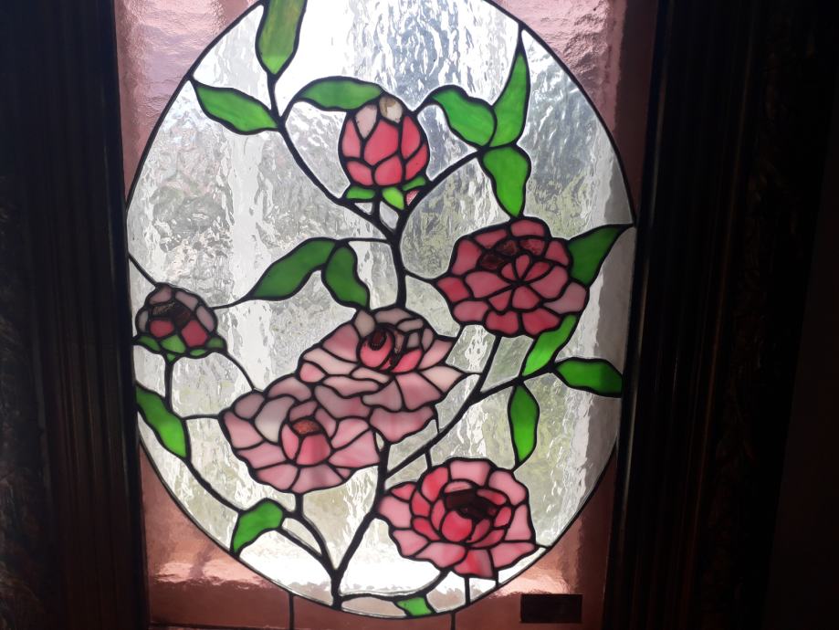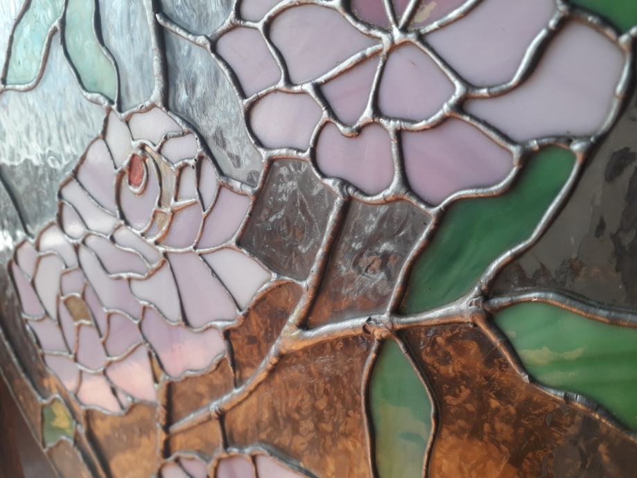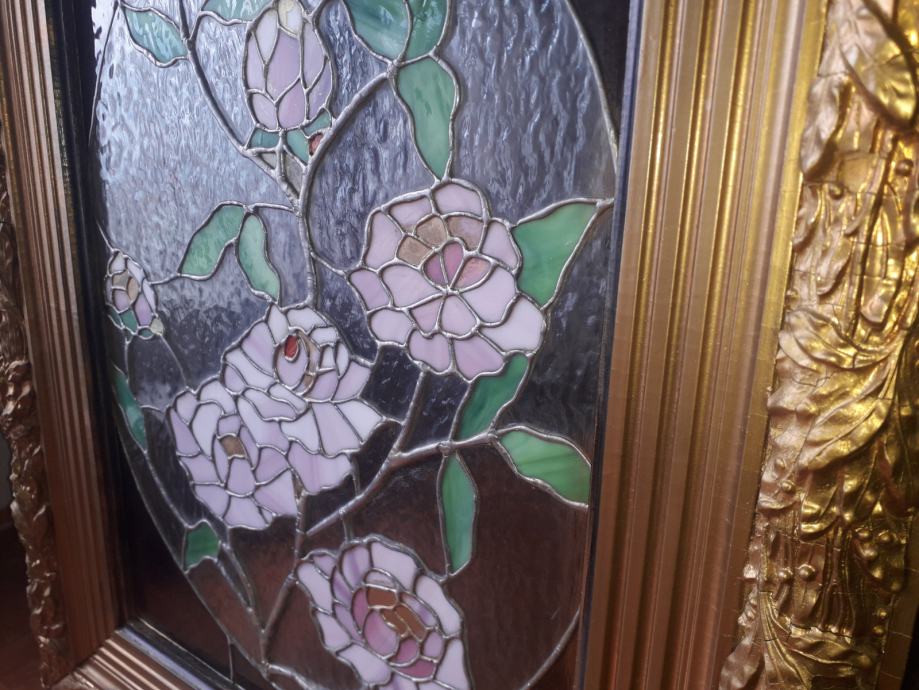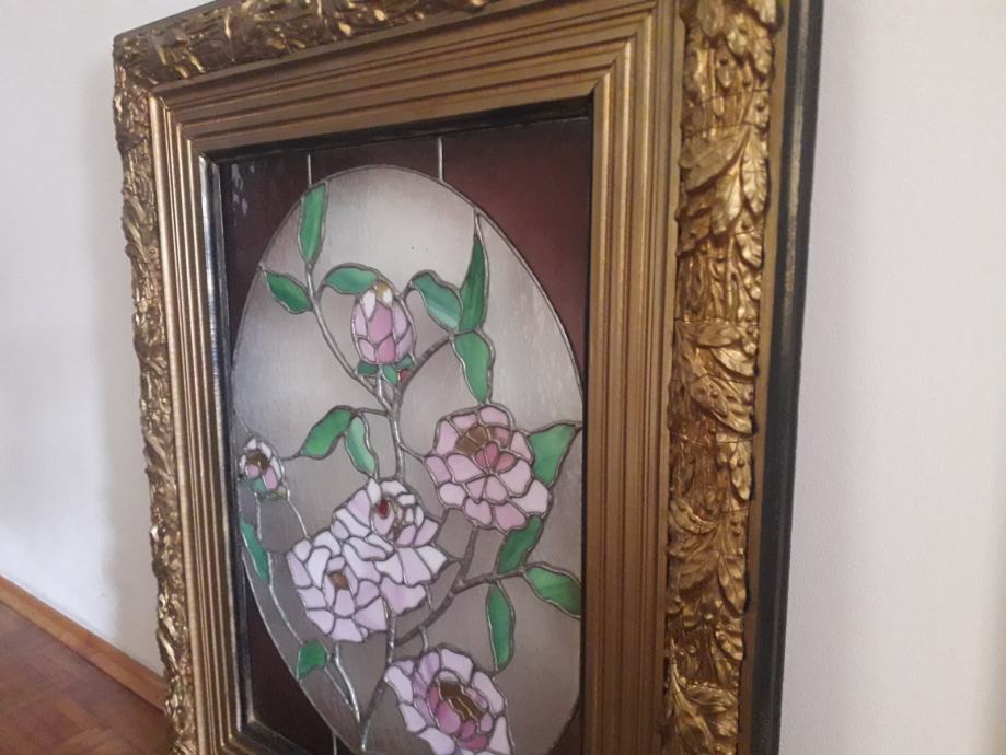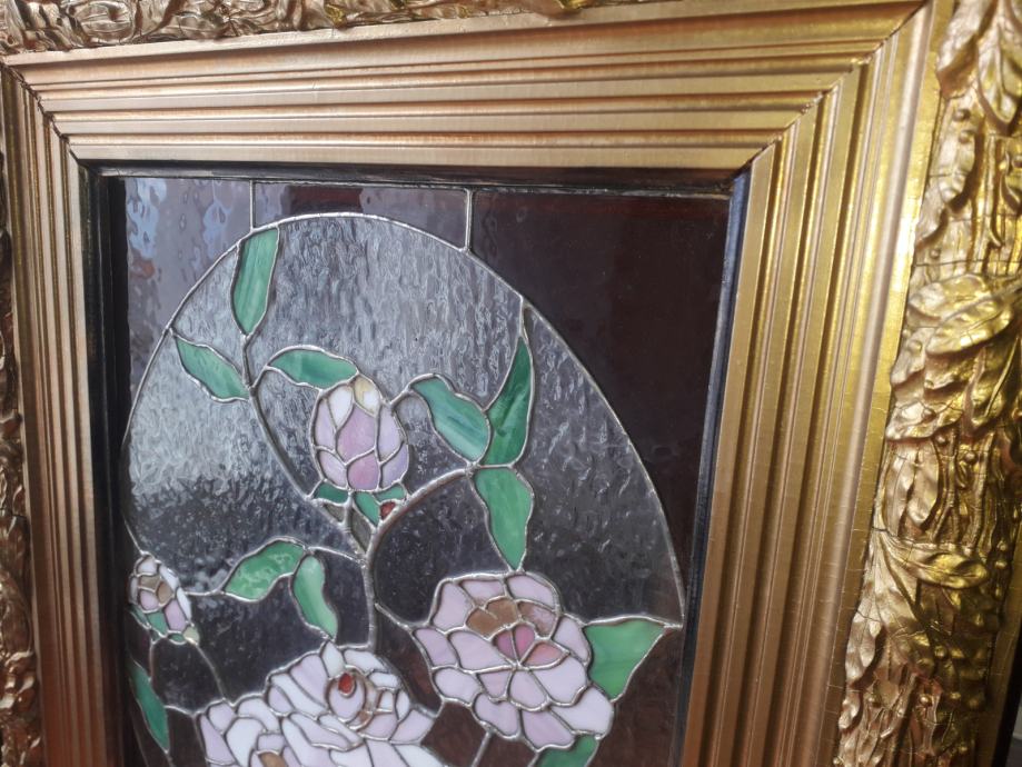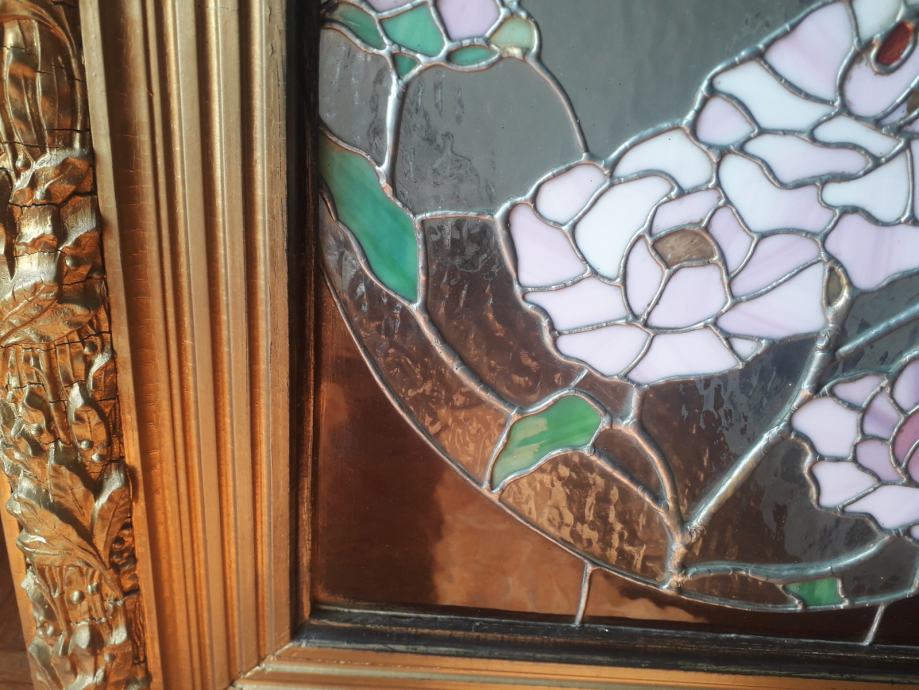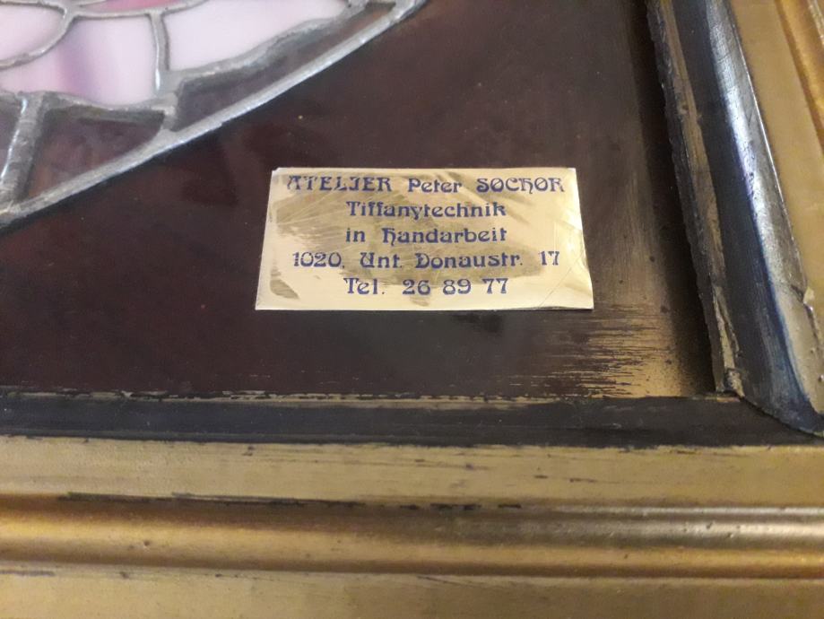 Vitraj u tiffany tehnici u antiknom okviru u izvrsnom stanju. Vitraj potječe iz umjetničke radionice Atelier Peter Bochor u Beču. Dimenzije okvira su 85x68 dok je vitraj dimenzija 59x43. Zbog težine okvira od osam kilograma moguče je jedino osobno preuzimanje.
