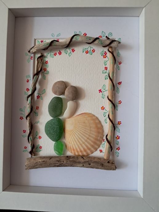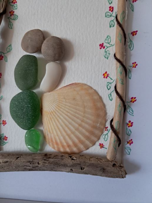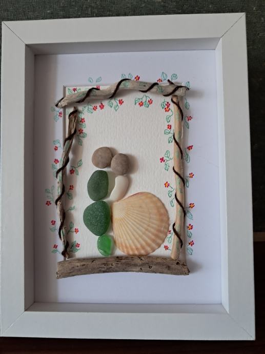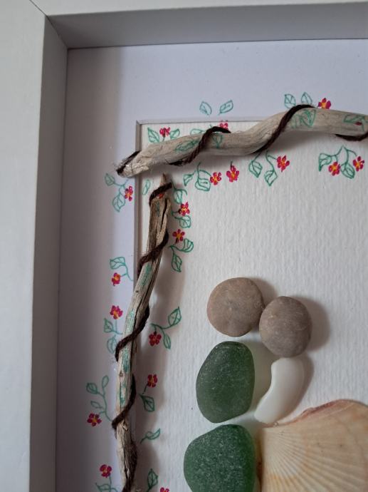 Ova slika izrađena je od kamenčića , morskih školjaka i naplavina.Može biti poklon za vjenčanje ili lijep ukras u vašem domu.Dimenzija slike je 22,5 × 17,5 cm.