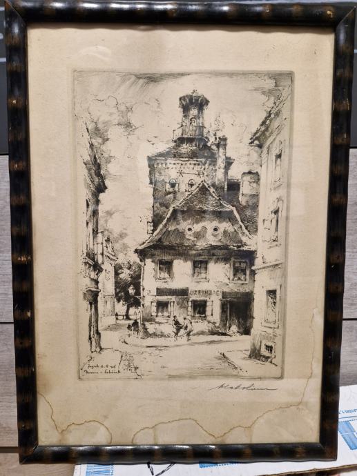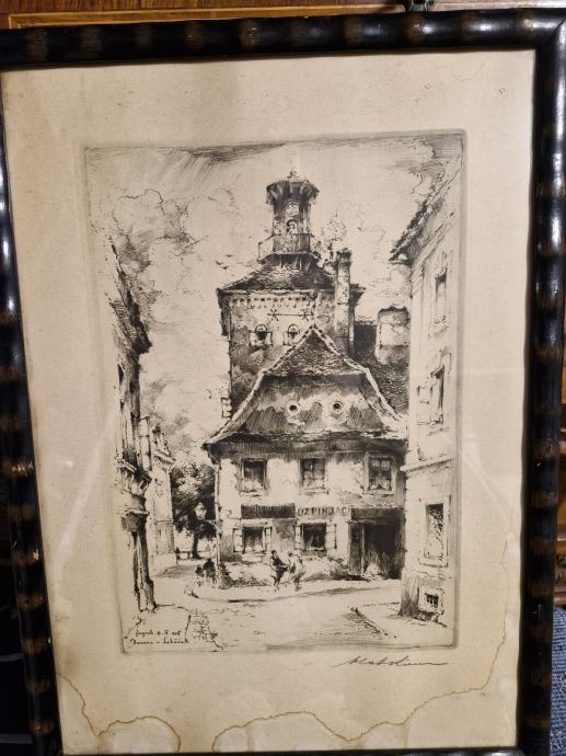 Prekrasna stara grafika u originalnoj rami iz vremena (što se vidi na poleđini), naprijed je staklo, u odličnom stanju sve. Vlaszoručno potpisan Vladimir Kirin, grafika Gornjeg grada "Kula Lotrščak), vrlo rijetko za naći, prekrasan primjerak po povoljnoj cijeni.