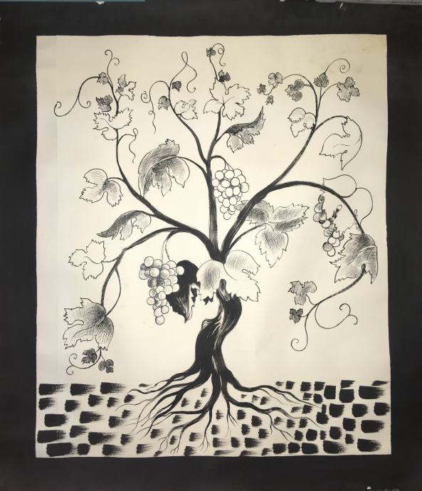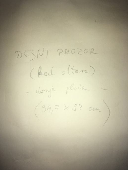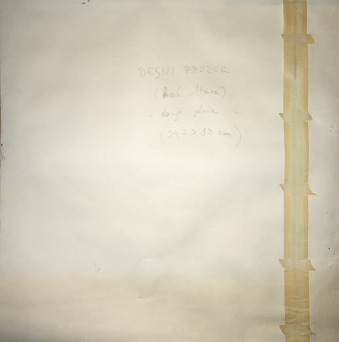 Skica za vitraj crkve (okolica Zagreba) poznatog hrvatskog akademskog slikara Vladimira Meglića. - 87x70cm. Crtano na spojenim/zalijepljenim papirima (vidljivo na fotografijama). Nije potpisano, na stražnjoj strani piše desni prozor (kod oltara), donja ploča. Dimenzije su 87x70cm.