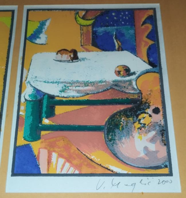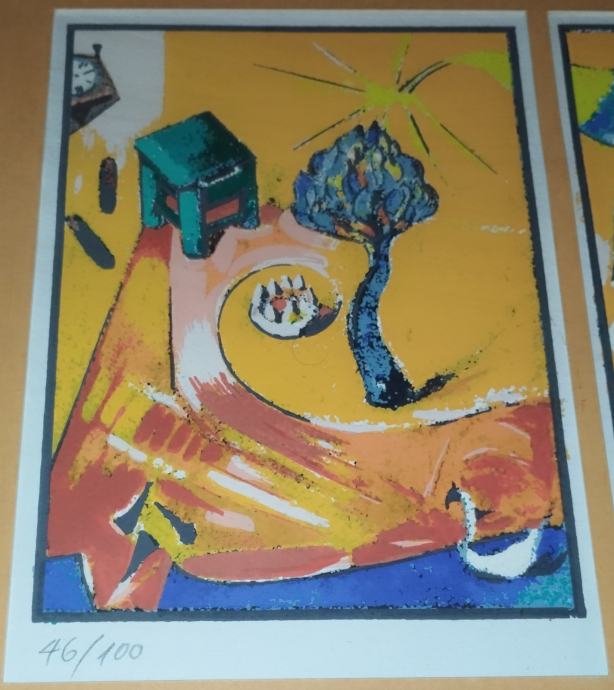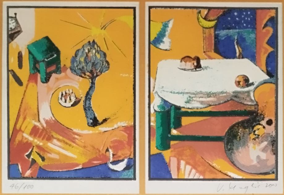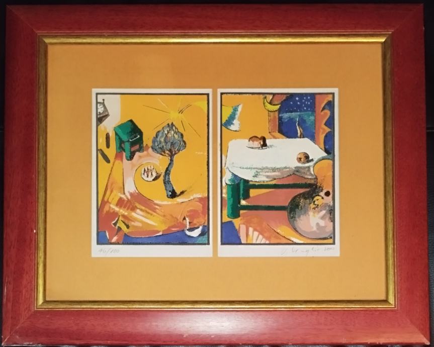 Akademski slikar. Potpisana grafika izrađena u obliku diptiha. Godina 2000. Galerijski uramljeno. Ukupne dimenzije s ramom 53/43cm.