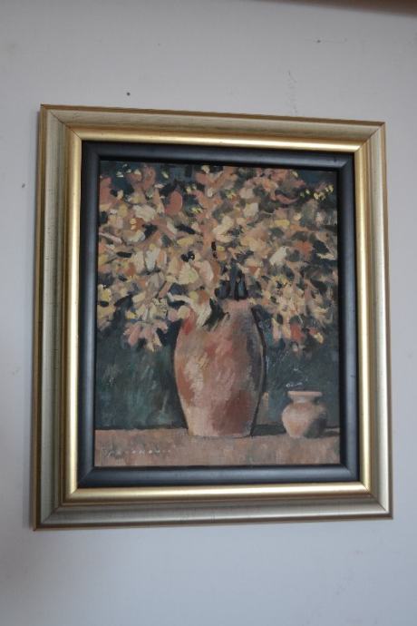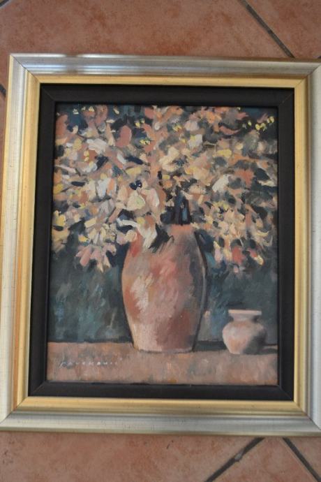 Slika ulje na platnu pokojnog akademskog slikara Vladimira Pavokovića. Potpisana, očuvana, motiv cvijeće. Ulje na šper-ploči. Dimenzije 27x33 cm (bez okvira). Uokvirena u novi crno-zlatno-srebrni okvir.