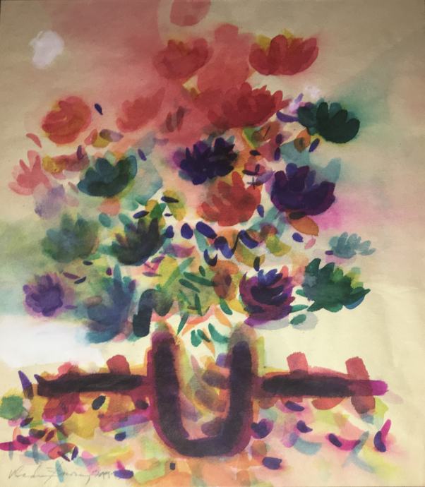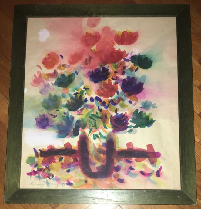 Vlado Burić – Cvjetni motiv, akvarel iz 1991., dimenzije s okvirom 56x50cm. Uokvireno i ostakljeno.
