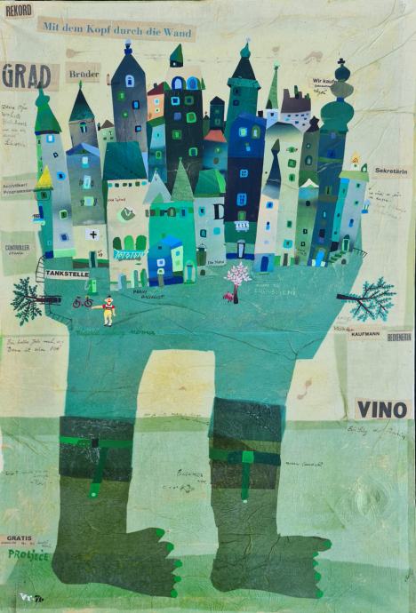 Vojo Radoičić "Klupa za zaljubljene" ulje kolaž na platnu 94x60cm;1971