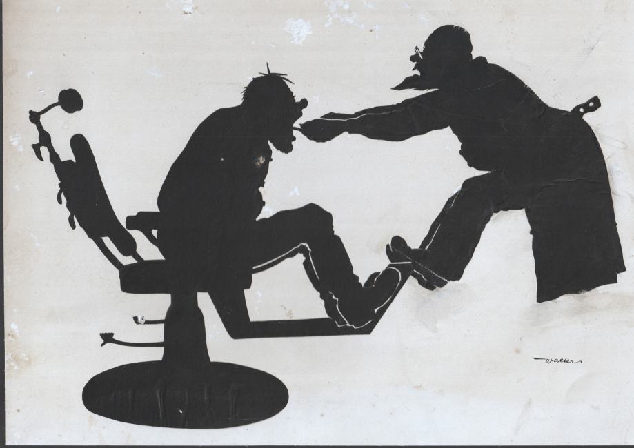 Crna silueta zubara i pacijenta oblikuje snažnu, gotovo kazališnu kompoziciju. Figura pacijenta zavaljena je u mehaničkoj stomatološkoj stolici, dok se zubar naginje prema njemu u dramatičnom iskoraku. Cijela scena reducirana je na čistu igru crne mase i bijelog prostora, bez unutarnjih detalja — što pojačava ekspresiju i ironiju prizora.