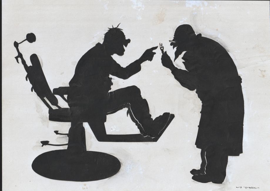 Rad „Kod zubara” pripada tradiciji umjetnosti siluete, u kojoj je crna plošna masa dominantni likovni element. Autor Wacker prikazuje duhovitu i pomalo grotesknu scenu iz svakodnevice — pacijenta u zubarskoj stolici i zubara koji proučava izvađeni zub.