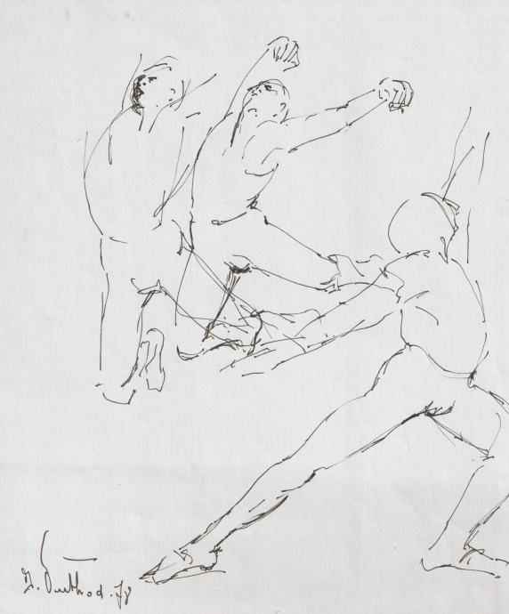 Energijska, ekspresivna figuralna kompozicija izvedena sigurnim i brzim potezima pera, datirana 1979. godine. Rad prikazuje tri naglašeno dinamične figure u snažnoj međusobnoj interakciji – tijela su zategnuta, ruke podignute u dramatičnoj gesti, dok linija vibrira i nosi cijelu kompoziciju.