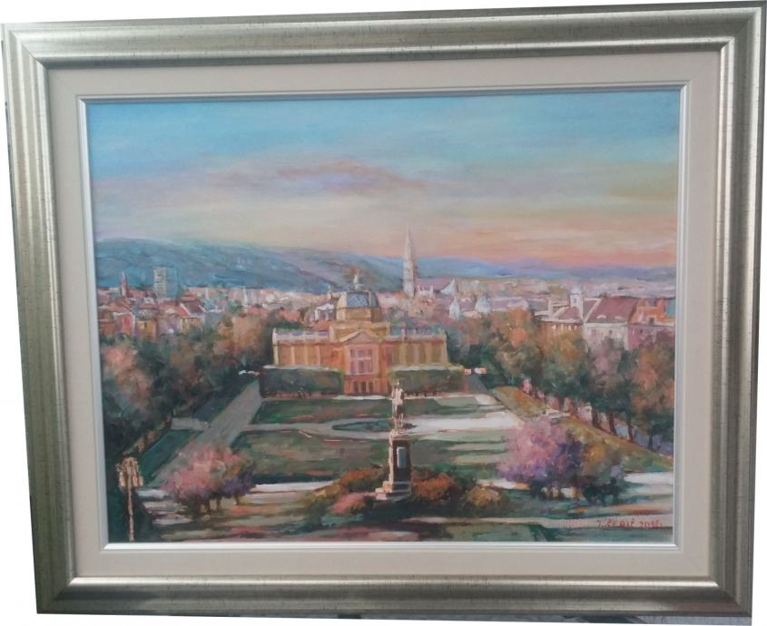 Zagreb, umjetnička slika na platnu uokvirena vel. 68 x 56 cm autora Tomislava Šerića. Može slanje poštom o trošku kupca.