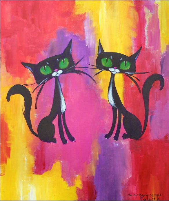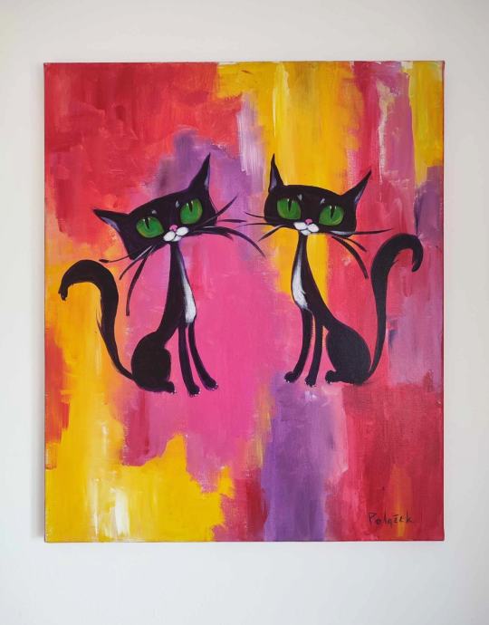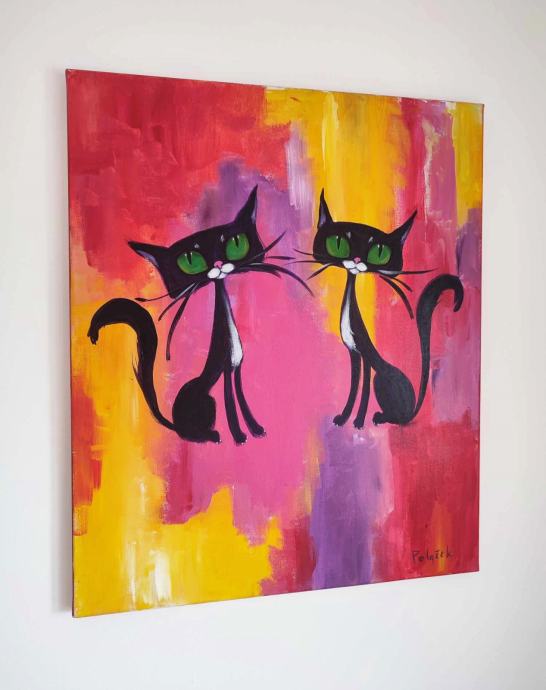 Mačkoslika - Zelenooke mačke, umjetnička slika, akad.slikarica Polaček