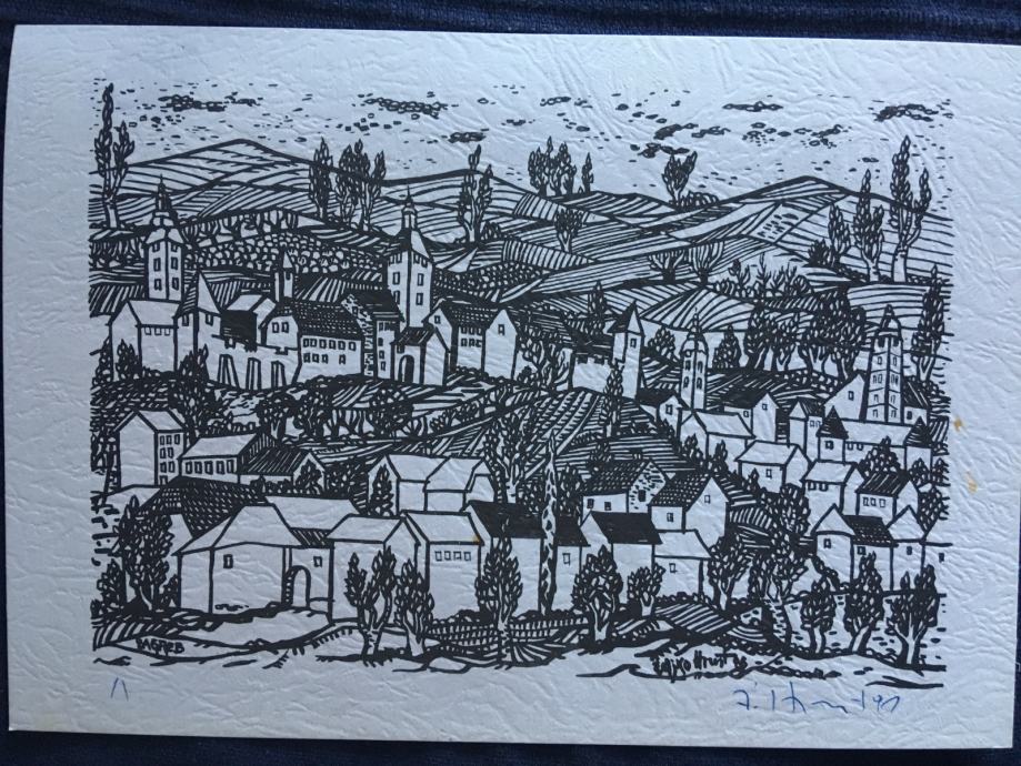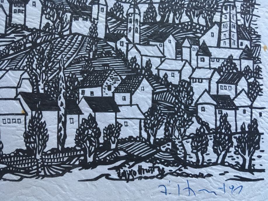 Potpisana grafika hrvatskog slikara Željka Hrusta. Motiv je Pejzaž. Dimenzije 26x15cm.