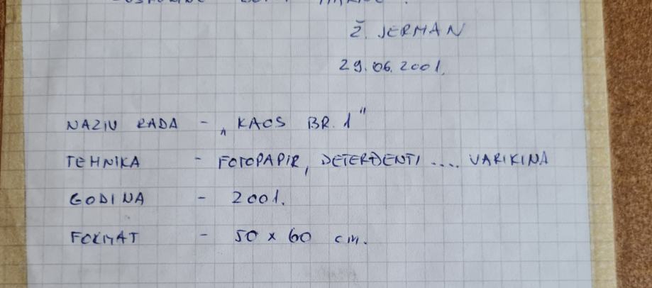 Prodajem sliku na fotopapiru Željka Jermana pod naslovom "Kaos br 1", dimenzije 50x60, osobni dar s posvetom, 2001. god.