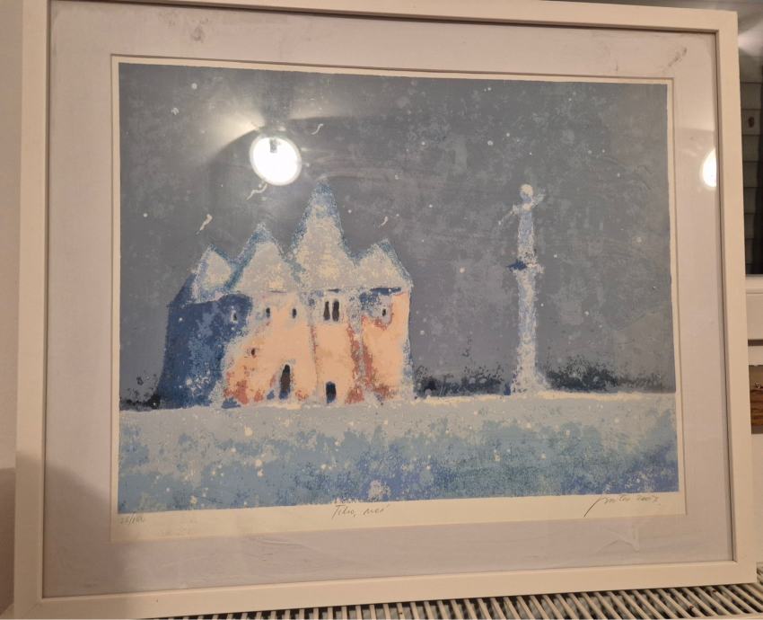 Rad prepoznatljivog autorova rukopisa s motivom arhitekture i zimskog noćnog ugođaja, izraženih plavih tonova i mirne atmosfere.
