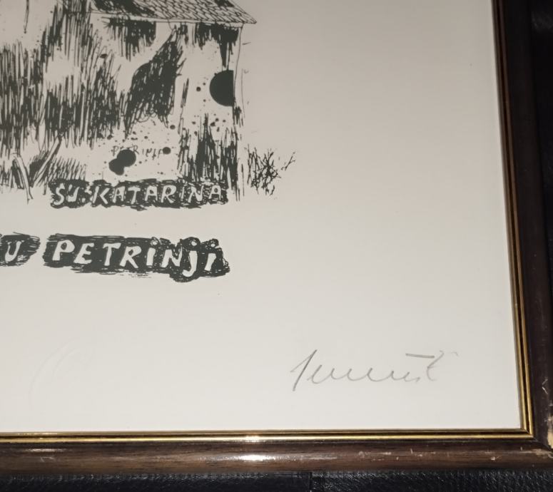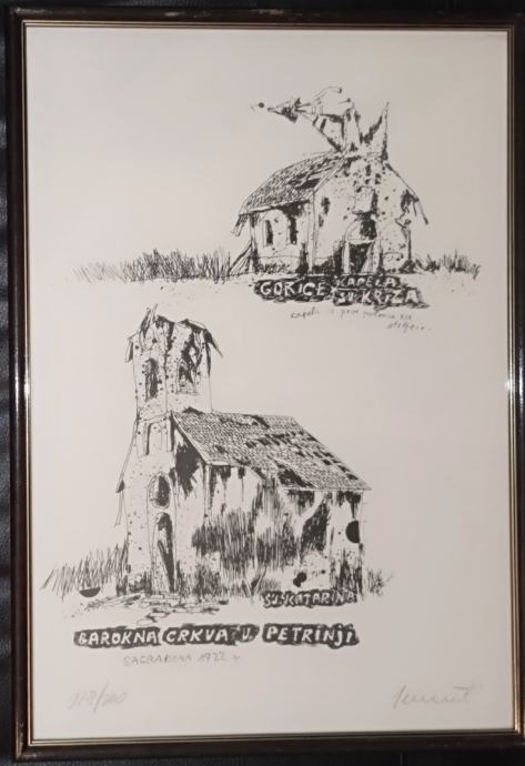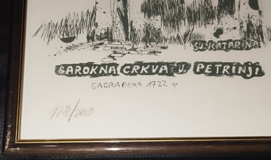Potpisana grafika s motivom Barokne crkve Sv. Katarina (Petrinja) poznatog hrvatskog slikara, scenografa, pisca i filmskog djelatnika, Željka Senečića. Galerijski okvir sa staklom. Dimenzije s okvirom 51x36cm.