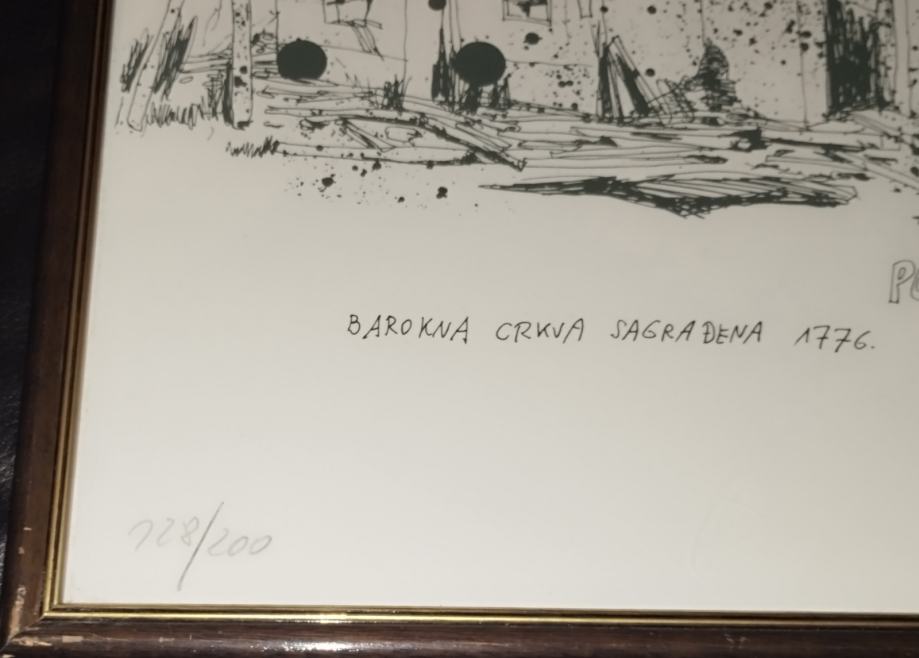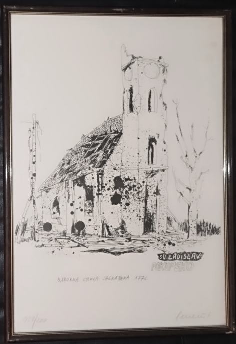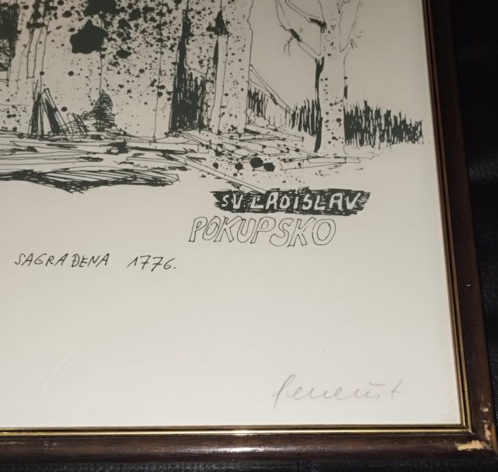 Potpisana grafika s motivom Barokne crkve Sv. Ladislav (Pokupsko) poznatog hrvatskog slikara, scenografa, pisca i filmskog djelatnika, Željka Senečića. Galerijski okvir sa staklom. Dimenzije s okvirom 51x36cm.