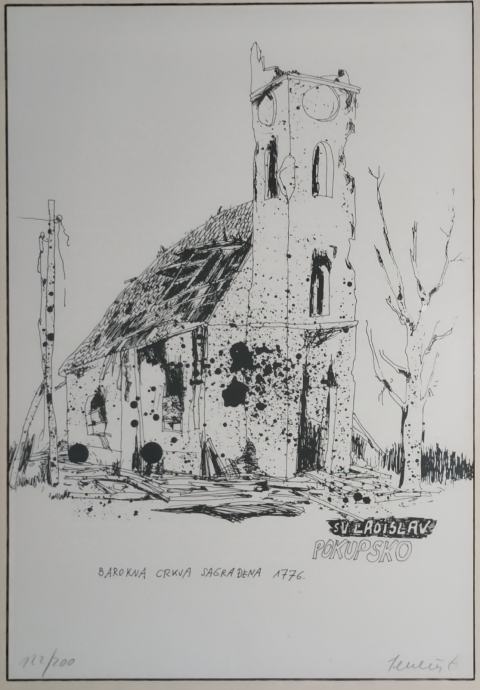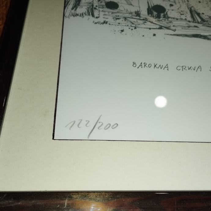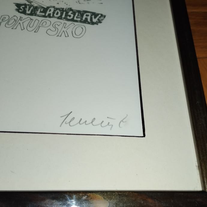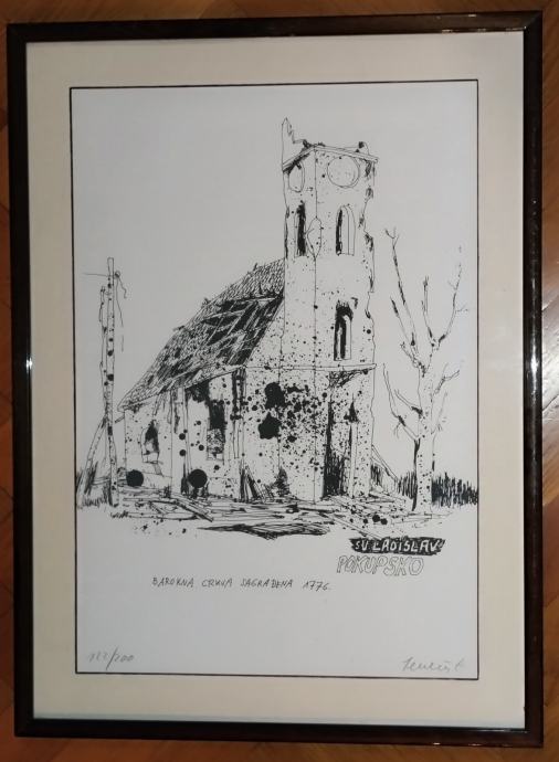 Potpisana grafika s motivom Barokne crkve Sv. Ladislav (Pokupsko) poznatog hrvatskog slikara, scenografa, pisca i filmskog djelatnika, Željka Senečića. Galerijski okvir sa staklom. Dimenzije s okvirom 56x42cm.