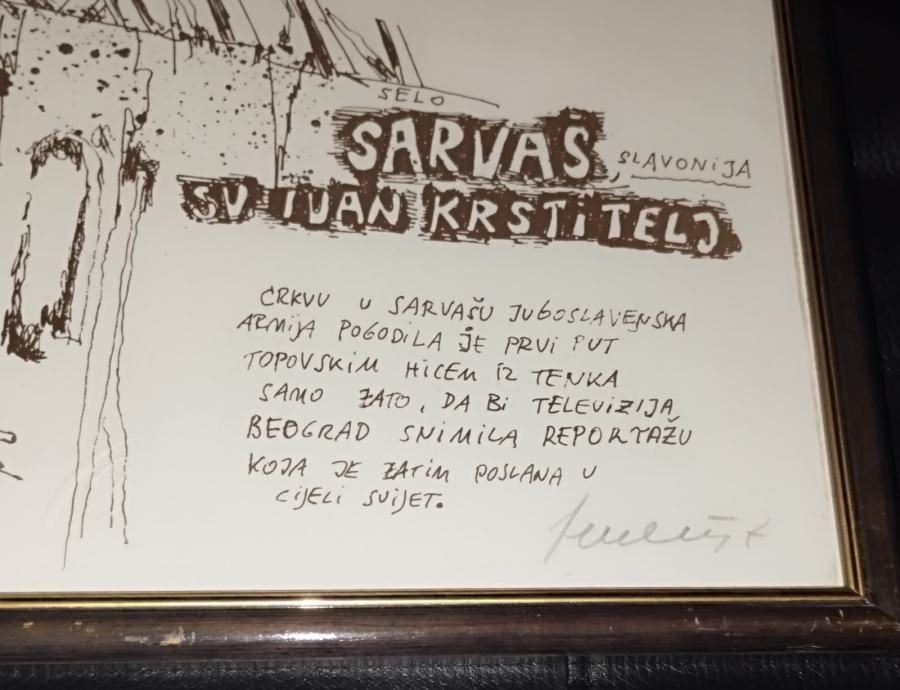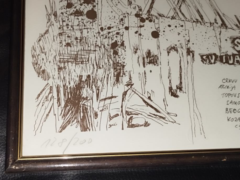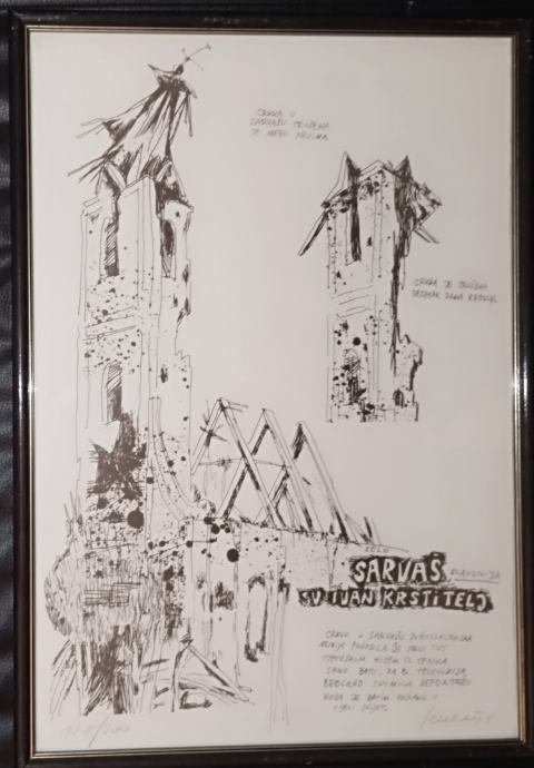 Potpisana grafika s motivom crkve Sv. Ivana Krstitelja (Sarvaš) poznatog hrvatskog slikara, scenografa, pisca i filmskog djelatnika, Željka Senečića. Galerijski okvir sa staklom. Dimenzije s okvirom 51x36cm.