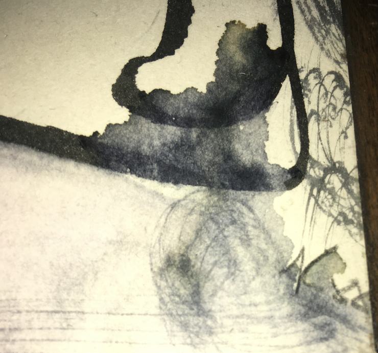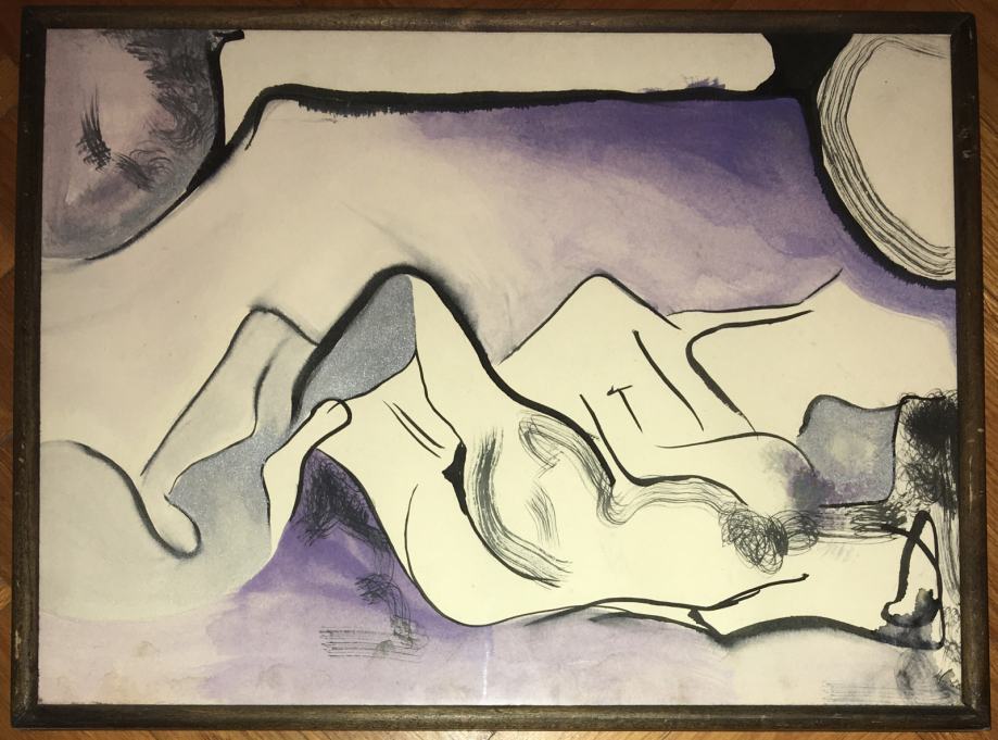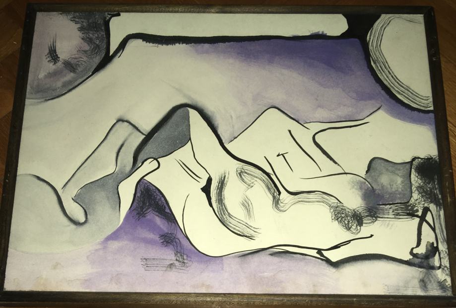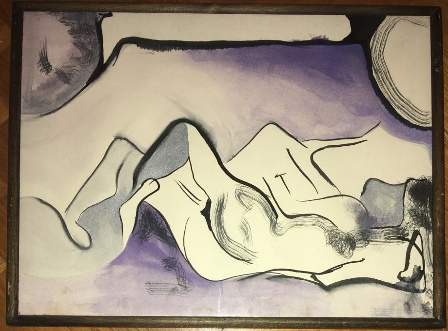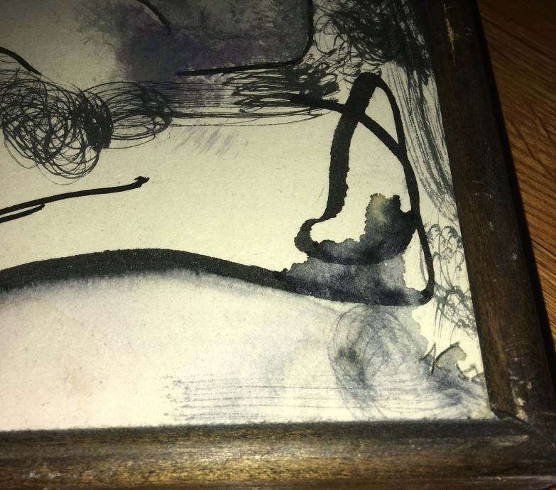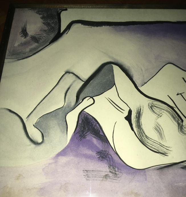 Crtež tušem (s akvarelom iz 1988.g. s motivom ženskog akta. Nečitko potpisano (MK ili nešto sl.). Galerijski uokvireno i ostakljeno. Dimenzije s okvirom su 41x31cm.