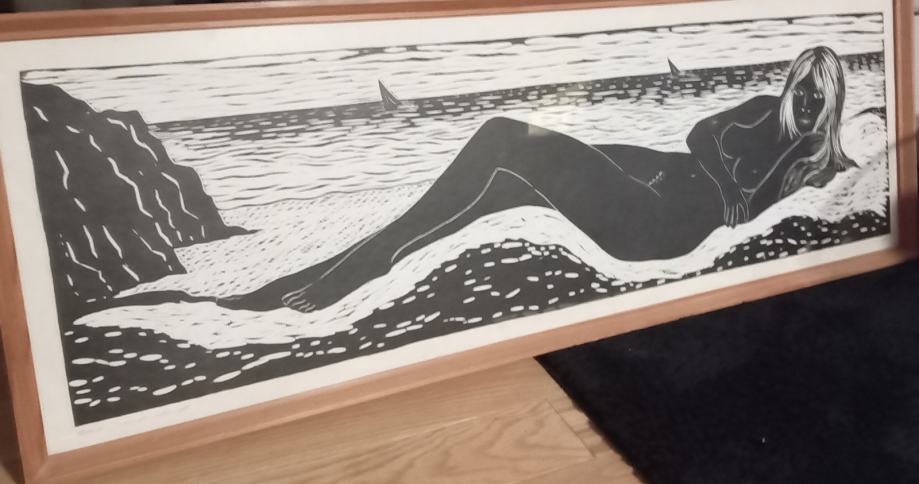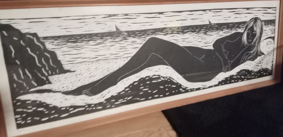 prodajem linorez na papiru, zenski akt na plazi, umjetnika Juliusa Kollera.
