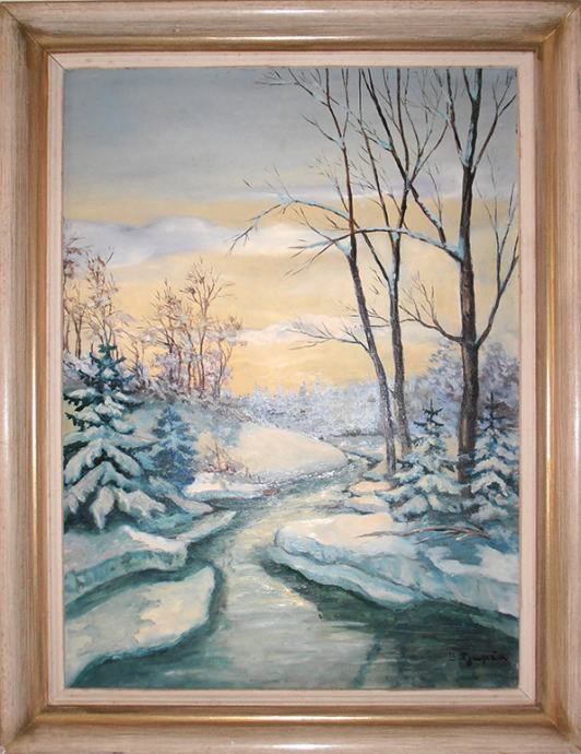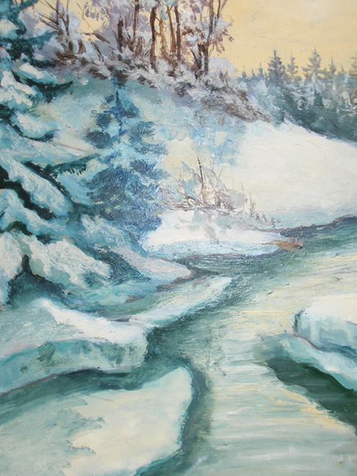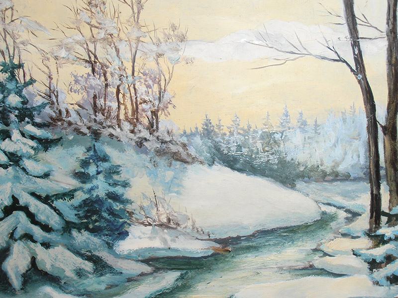 Stara slika, ulje na lesonitu. Zimski pejzaž, snjeg.. 55 x 43 cm