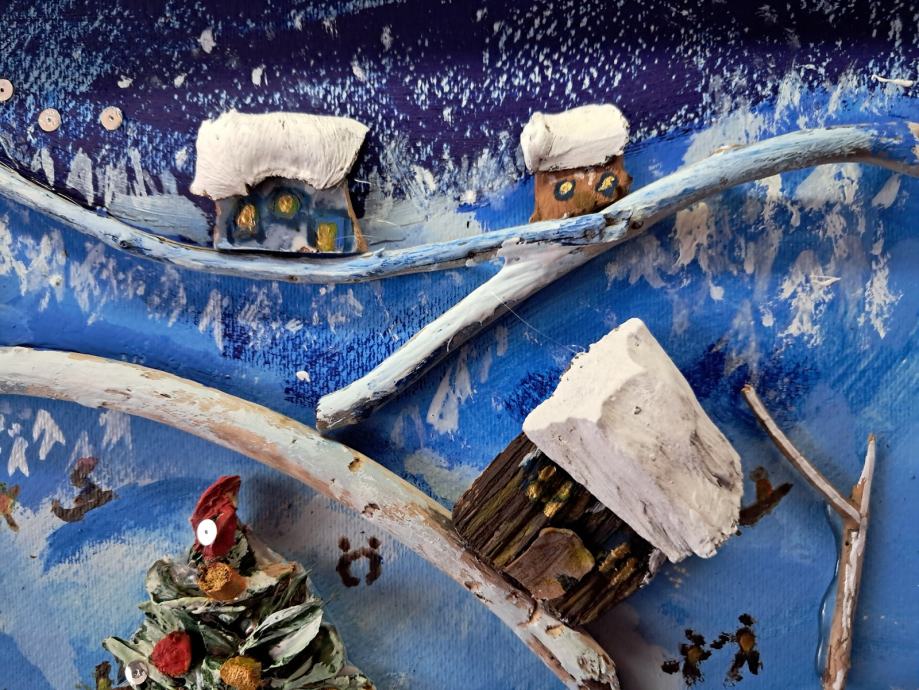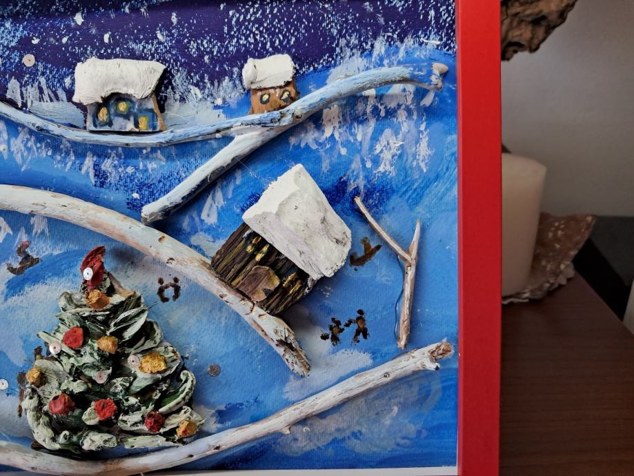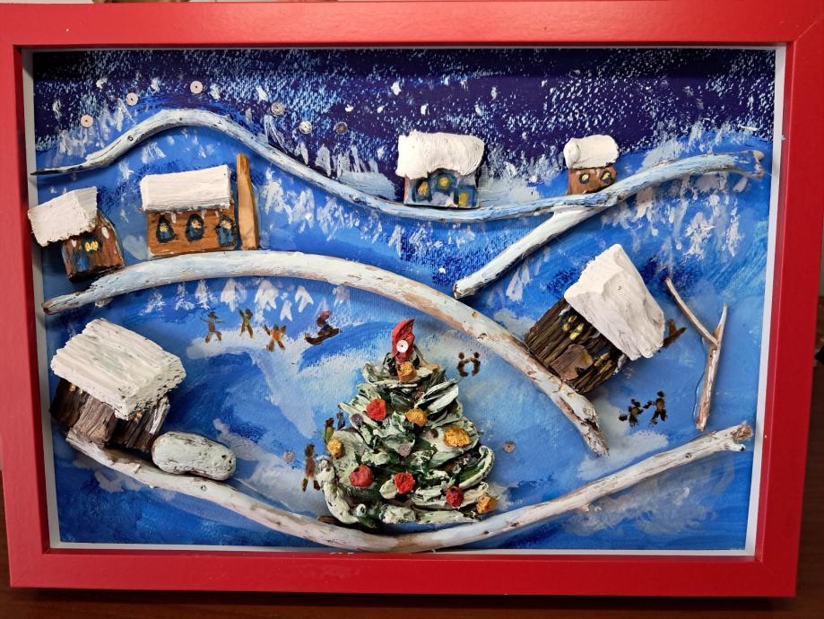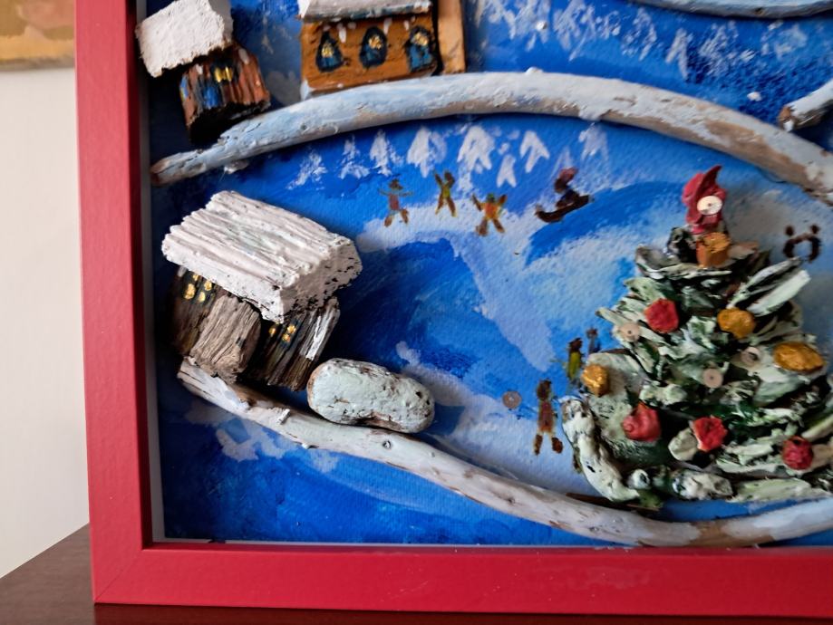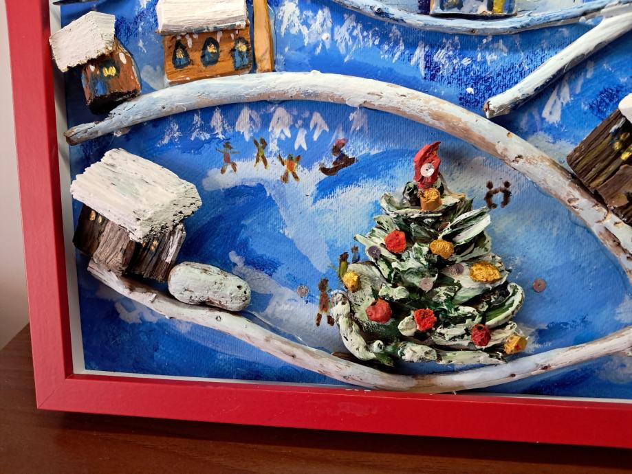 Ova slika izrađena je od morskih naplavina i obojana akrilnim bojama.Svojim ugođajem zamišljamo zimsku noć kao ovu.Dimenzija slike je 32 × 23 cm.
