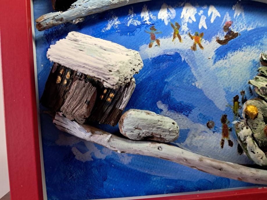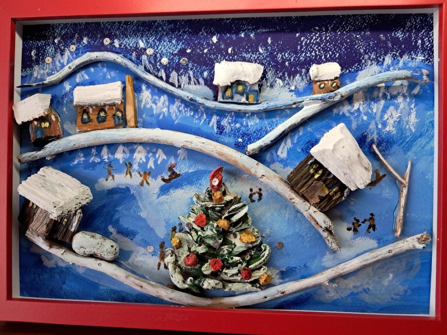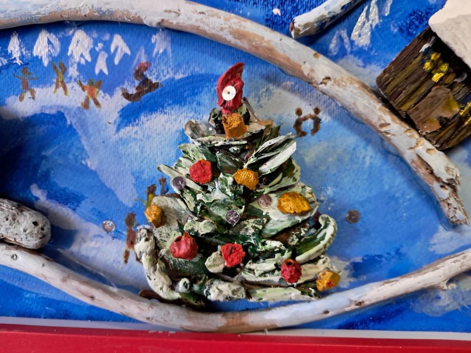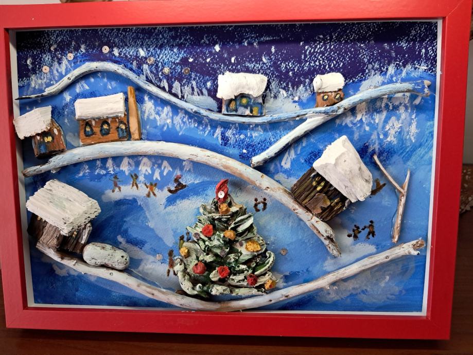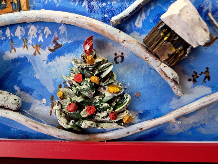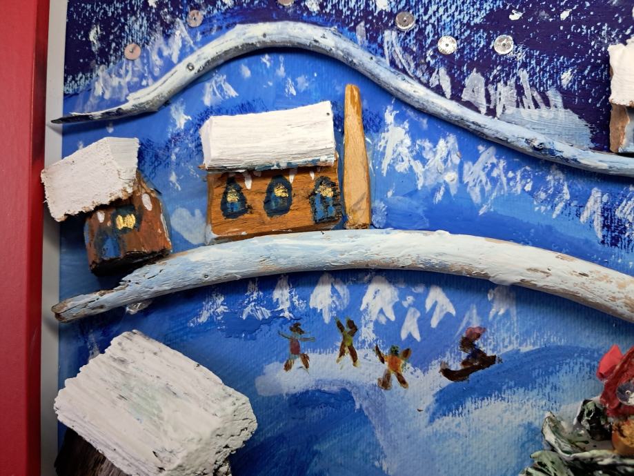 Ova slika izrađena je od morskih naplavina i obojana akrilnim bojama.Svojim ugođajem zamišljamo zimsku noć kao ovu.Dimenzija slike je 32 × 23 cm.
