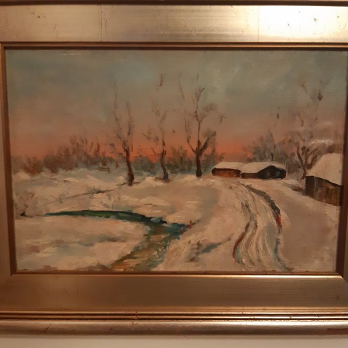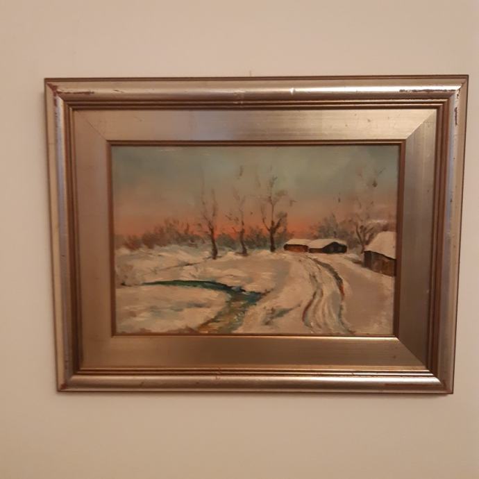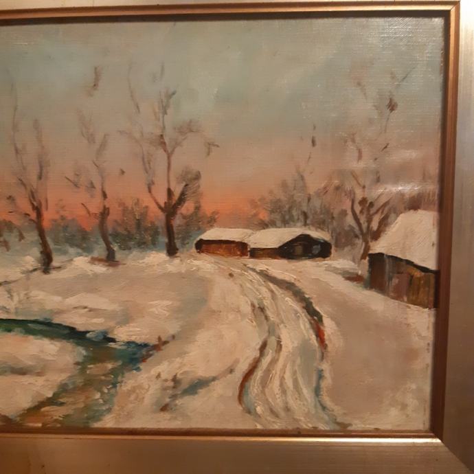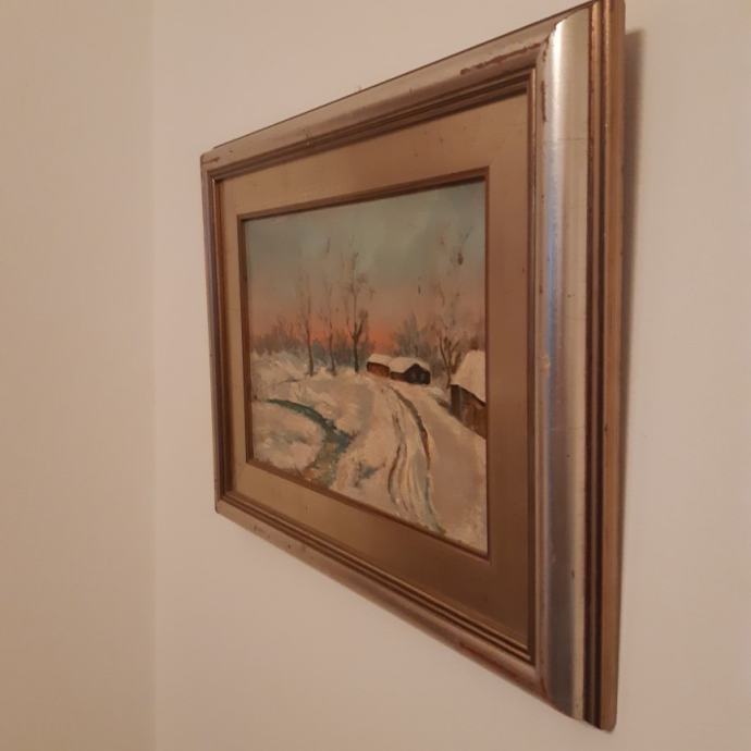 Zimski pejzaž jako lijepo napravljeno tehnikom ulja na kartonu.Dimenzije slike su 46x32cm sa okvirom 49x38cm