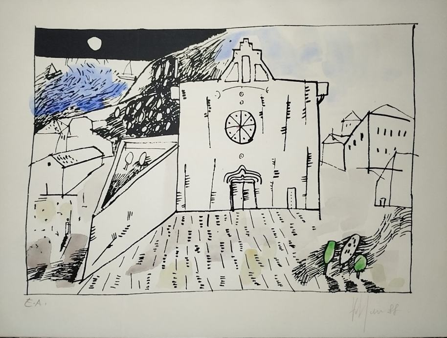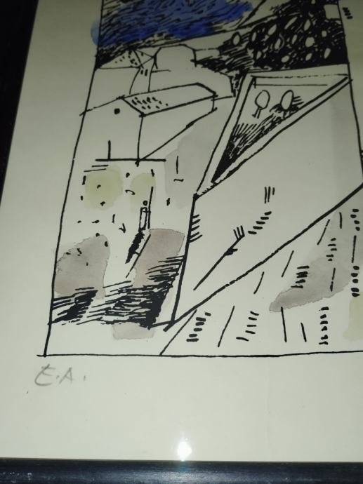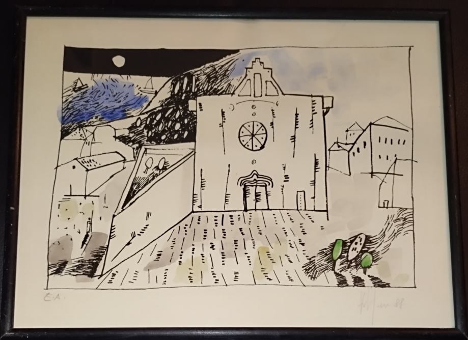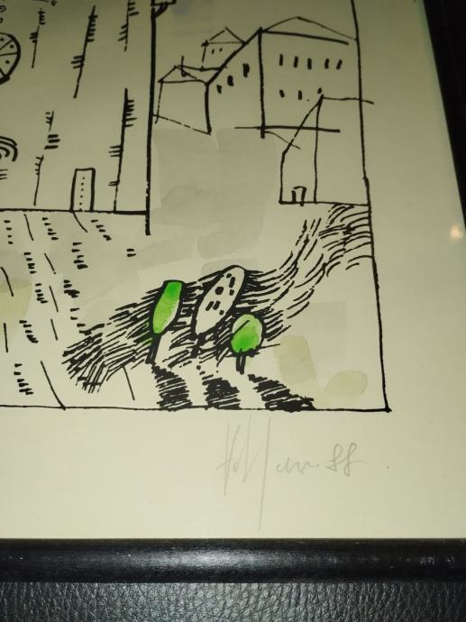 Grafika iz 1988.g. Autor je akademski slikar Zlatan Vrkljan. Uramljeno. S okvirom 41/32cm.