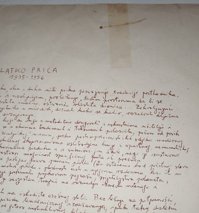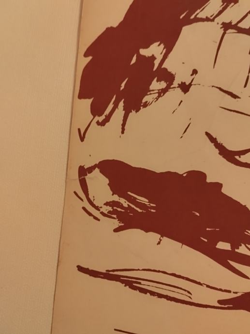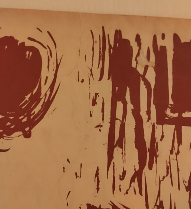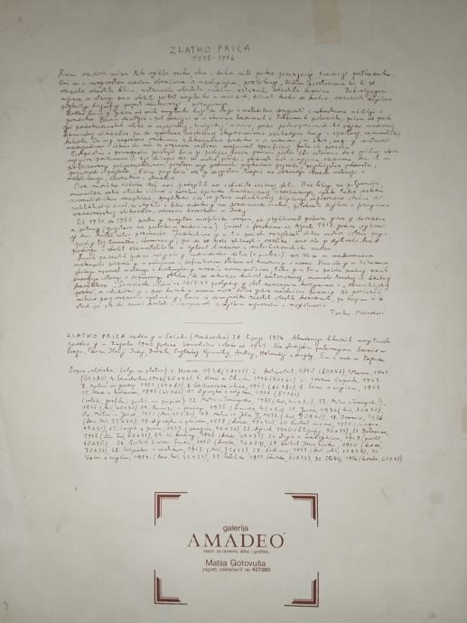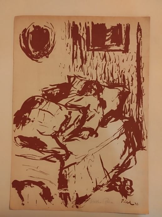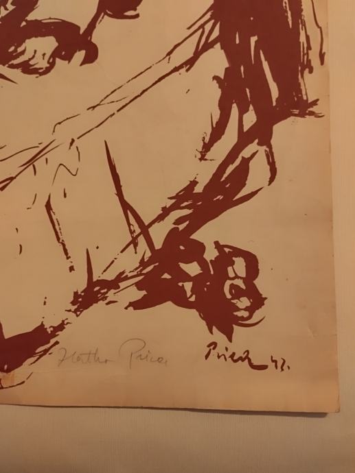 Olovkom potpisana grafika s motivom ranog rada čuvenog hrvatskog slikara. Dimenzije lista 50x35cm. Sa stražnje strane otisnut tekst vezan uz izložbu ranih radova umjetnika. Grafika na rubovima ima manjih oštećenja (zalijepljenih) vidljivih na fotografijama.