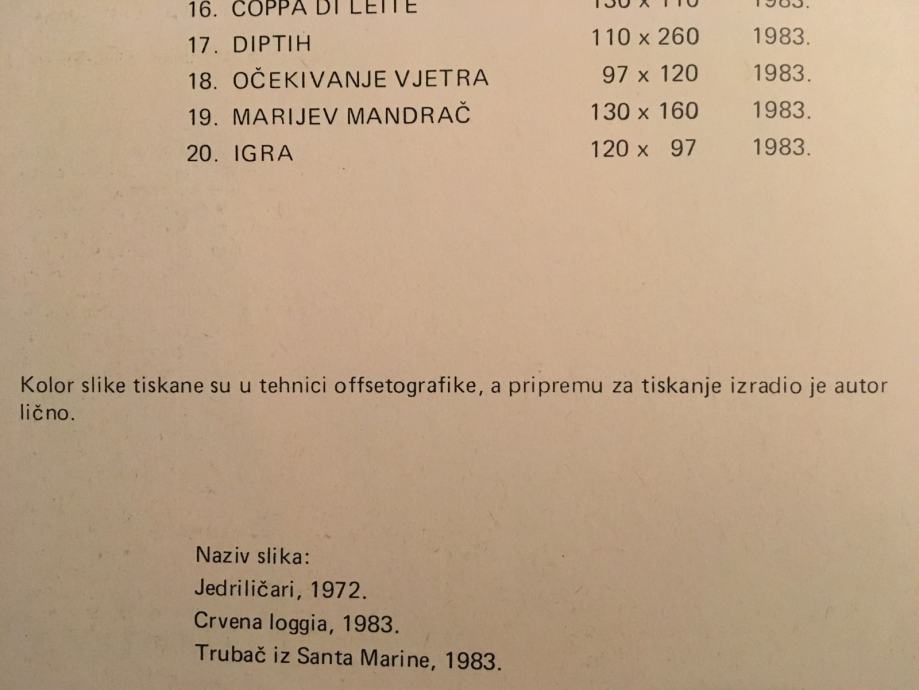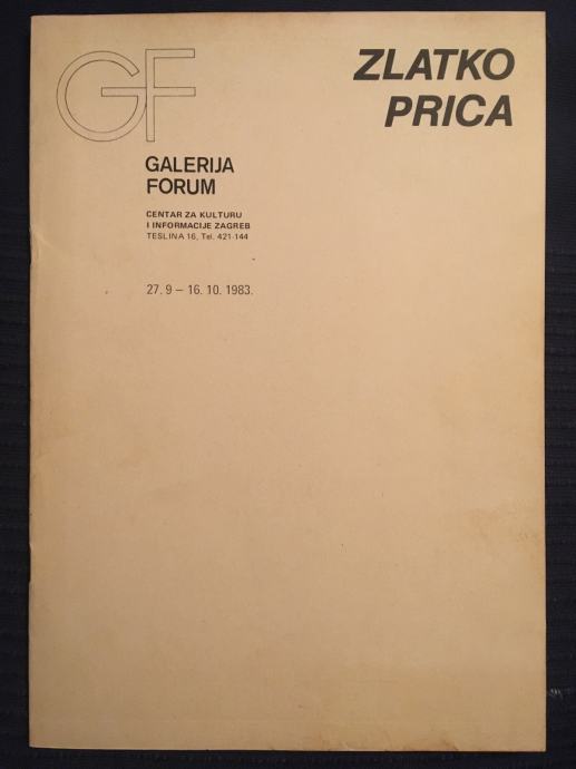 Katalog izložbe održane u Galeriji Forum 1983.g. čuvenog hrvatskog slikara Zlatka Price. Katalog sadrži tri grafike (kako je navedeno, tiskane u tehnici offsetografike, a pripremu za tiskanje je učinio autor osobno). Dimenzije dviju manjih grafike su 24x17cm, dok je jedna veća grafika dimenzija 34x24cm). Grafike nisu potpisane i dio su kataloga.