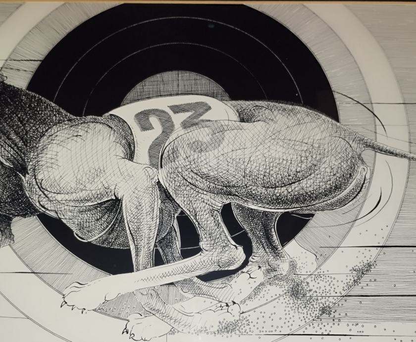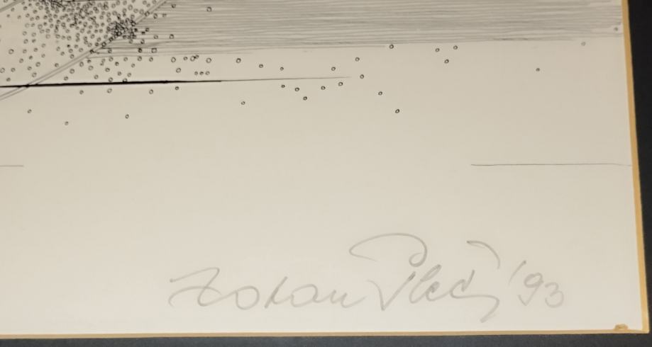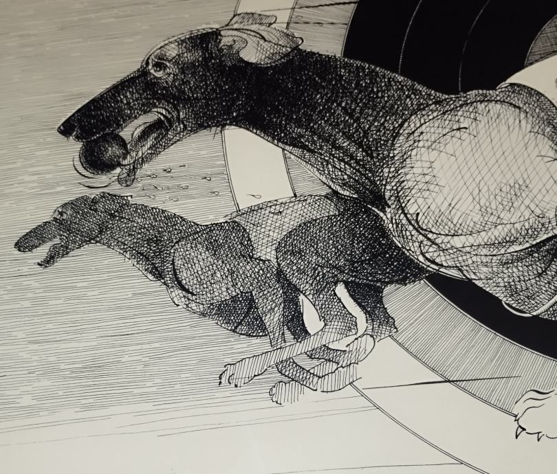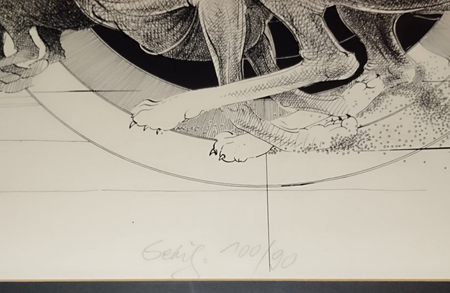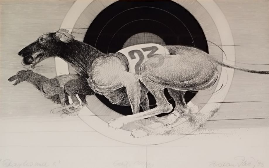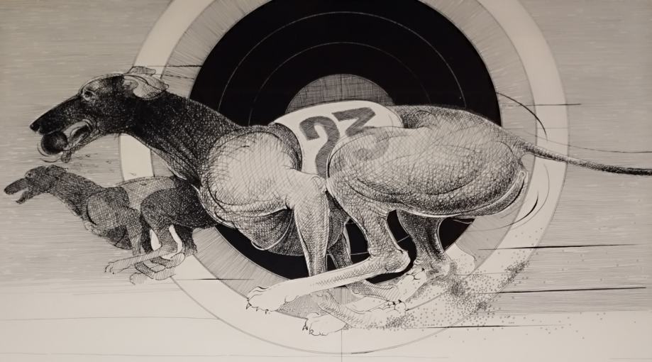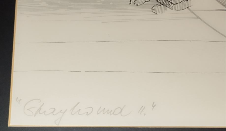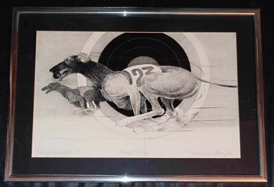 Serigrafija akademskog slikara, grafičara, ilustratora i restauratora. Motiv je pas hrt. Galerijski uramljeno. Ukupne dimenzije 63x45cm.