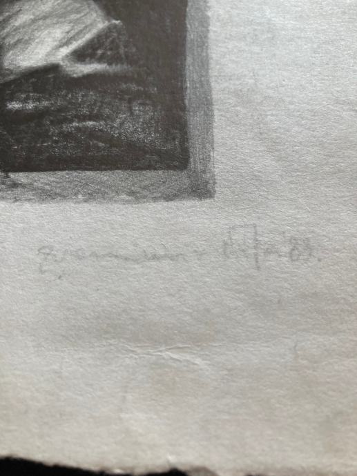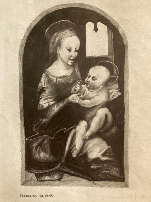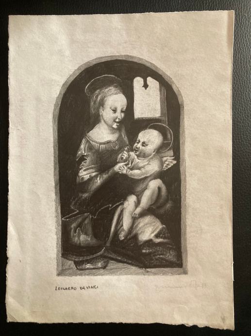Izvrstan crtež olovkom akademskog slikara i grafičara Zvonimira Vile. Dimenzije 31x22cm. Nacrtano prema jednom od prvih Leonardovih dijela "Madonna s cvijetom" (Benois Madonna).
