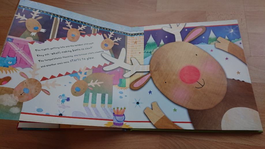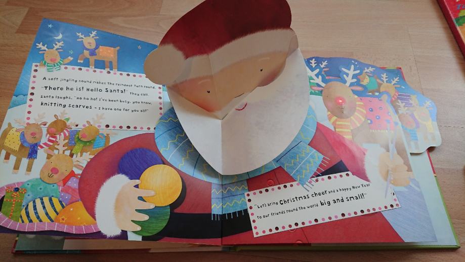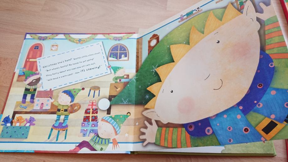 1. Slikovnica Hello Santa na engleskom jeziku, tvrdi uvez, ima pop-up prozorčić djeda Mraza na kraju, zasvijetli nos od Rudolfa i svira Jingle Bells tj pjesmu Zvončići