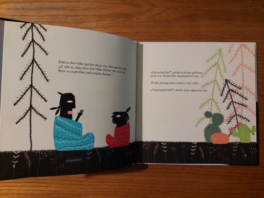 Priča bazirana na indijanskoj poslovici o dva vuka, jednom dobrom i jednom lošem, koji se bore u svima nama, a pobjeđuje onaj kojeg hranimo. Maleni Indijanac želio je nahraniti dobrog vuka, ali ga nigdje nije mogao pronaći, pa se zaputio u šumu u potragu. U šumi je sreo tri vuka: crnog vuka, bijelog vuka i sivog vuka. No sva trojica su za sebe tvrdili da su podjednako i dobri i loši. I samo vukovi. Gdje će mali Indijanac pronaći dobrog vuka i koga će nahraniti?