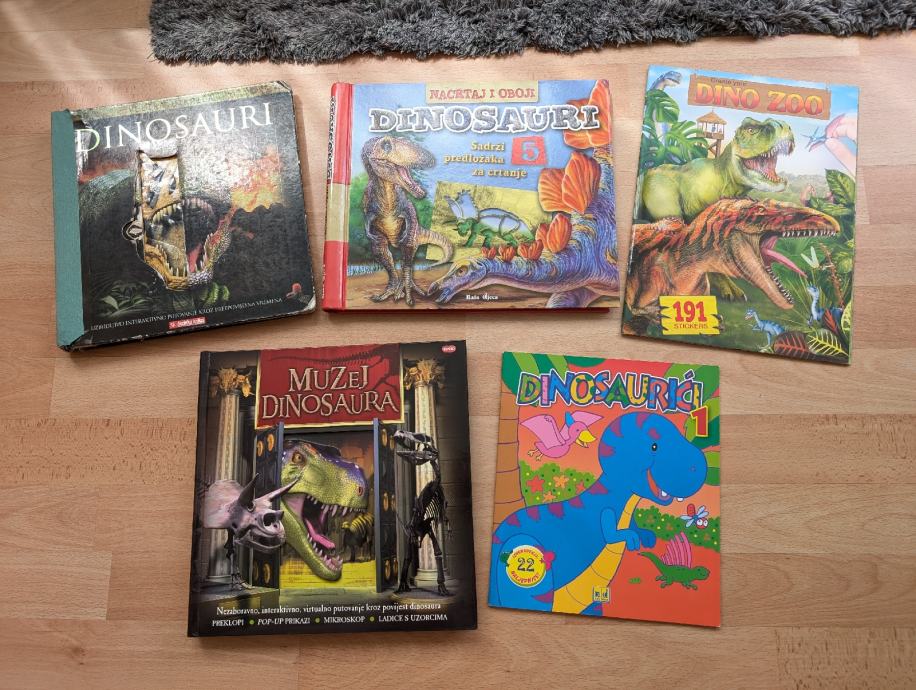 Dinosauri - veliki komplet koji sadrži knjige, slikovnice, puzzle, narukvice, blok za pisanje, privjesak srebrne boje, dvd, te lutka za igranje.